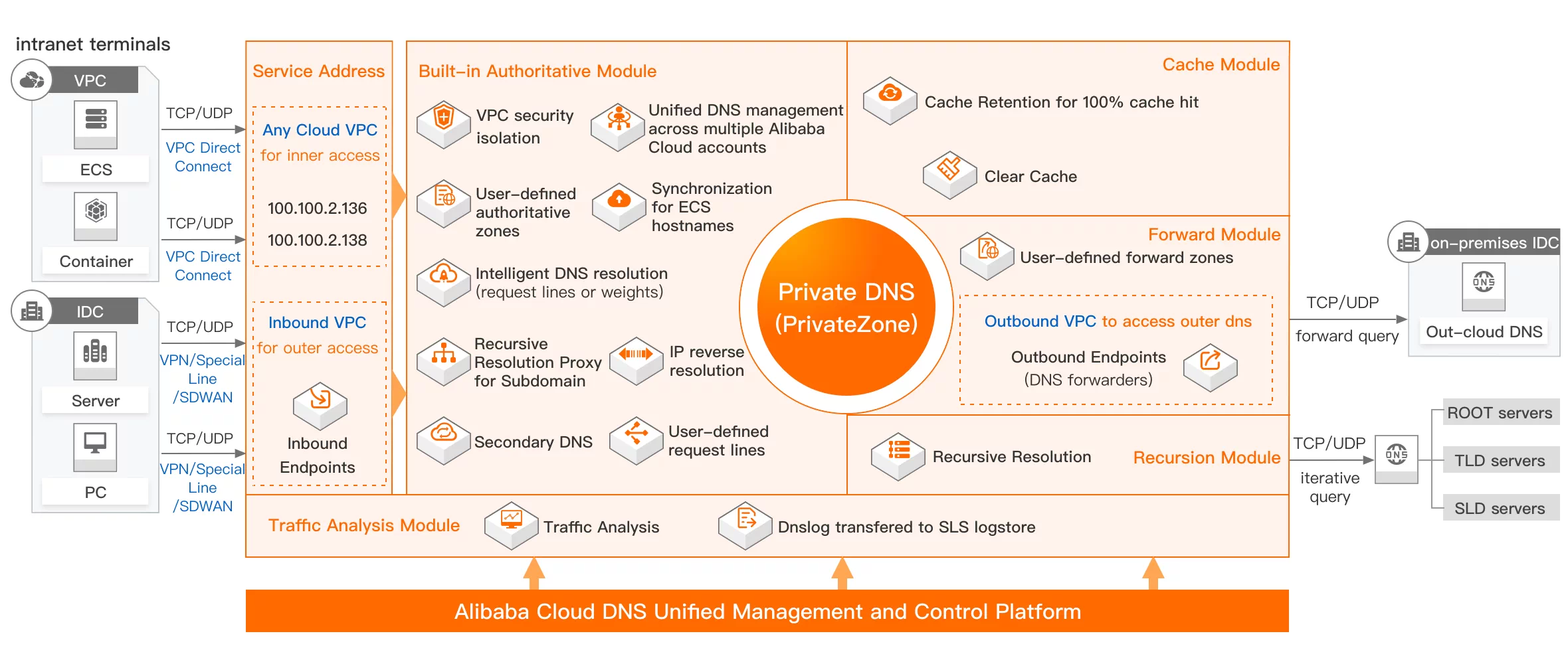 We provide private domain name resolution services for terminals and servers within the VPC network.