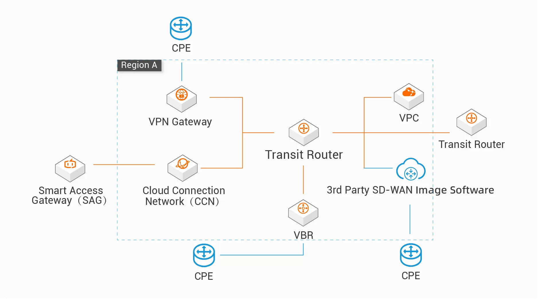Transit routers can be connected to SD-WANs of Fortinet, Cisco Meraki, Palo Alto, and Aruba. You can purchase on Alibaba Cloud Marketplace and perform a quick deployment to connect your on-premises network to Alibaba Cloud.