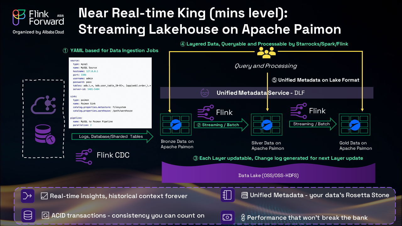 Changes flow from MySQL databases through Flink CDC, cascade through bronze, silver, and gold tables in Paimon, and feed into StarRocks for lightning-fast analytics.