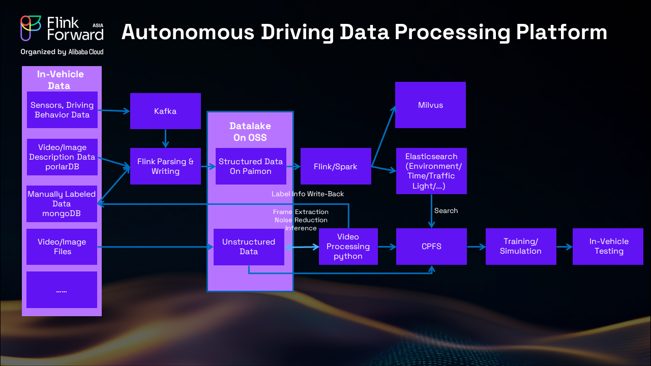 Structured Data: Kafka → Flink → Paimon → Elasticsearch analytics Unstructured Data: Video/image → Python processing → OPFS → Training simulations