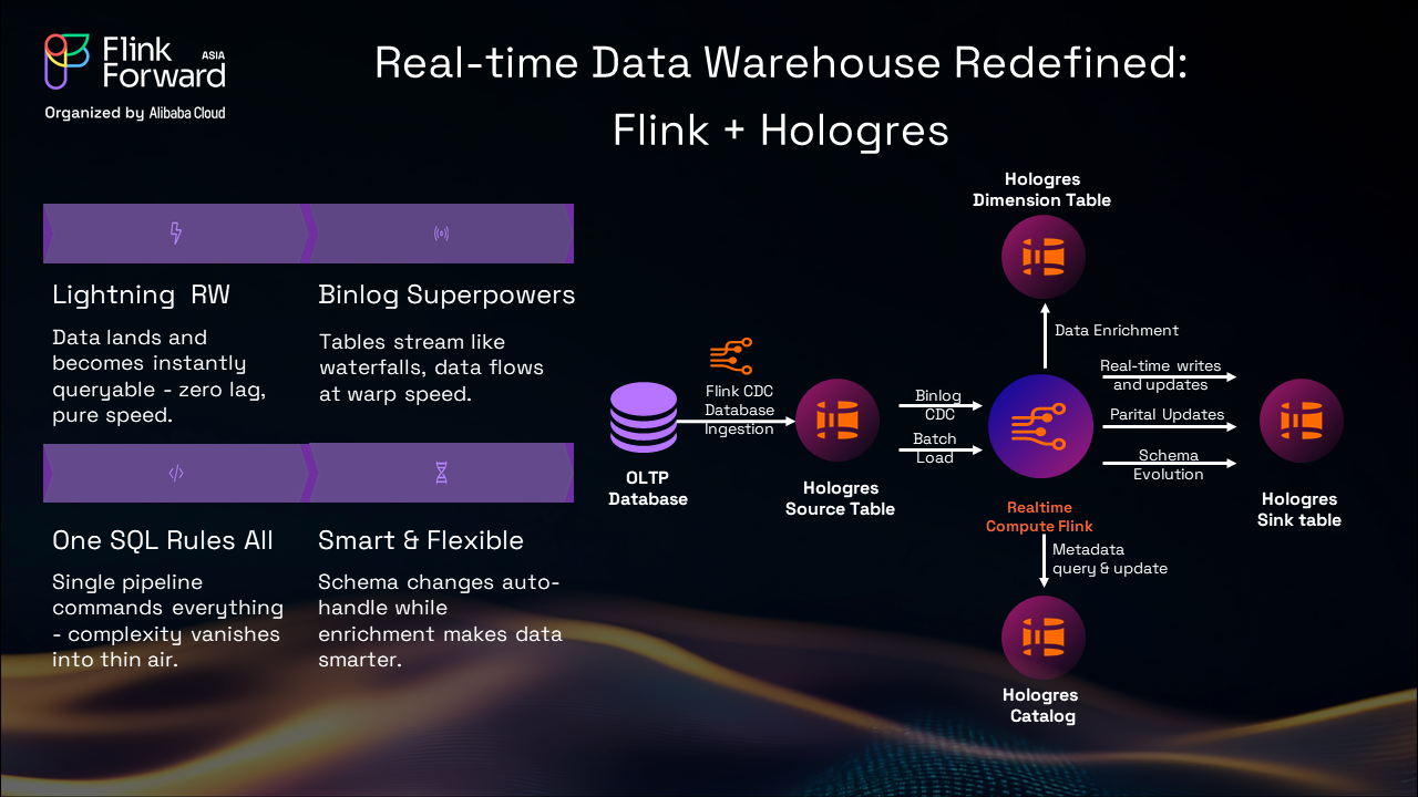 Binlog Superpowers: Using Flink CDC, every database change streams directly into Hologres, supporting both real-time and batch processing patterns.