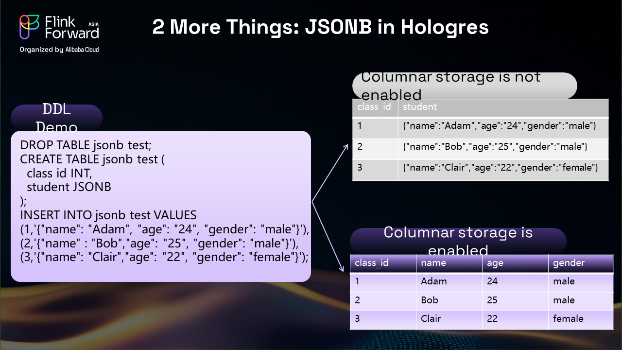 Hologres' JSON-B support provided the flexibility we needed for columnar storage while maintaining the ability to switch between storage modes based on specific requirements. When columnar storage isn't needed, we use standard storage modes, but when analytical queries require columnar access, we can easily switch to optimized columnar storage.