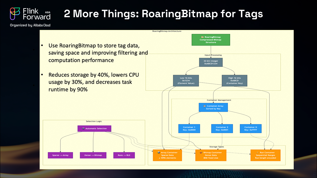Our team investigated and implemented Roaring Bitmap technology, which compresses tag data efficiently using 32-bit integers split into lower 16 and higher 16 bits. The system utilizes three types of data containers: sparse data with array containers, high-density data with bitmap containers, and sequential ranges with run containers.