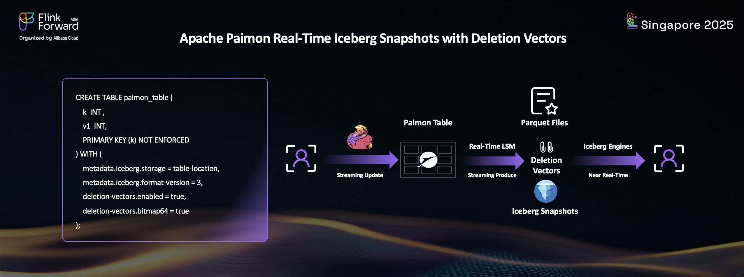 The introduction of deletion vector files in Iceberg V3 provided the technical foundation to bridge this gap. When Paimon tables are configured with Iceberg compatibility, the system automatically generates Iceberg snapshots including real-time data files with corresponding deletion vectors.