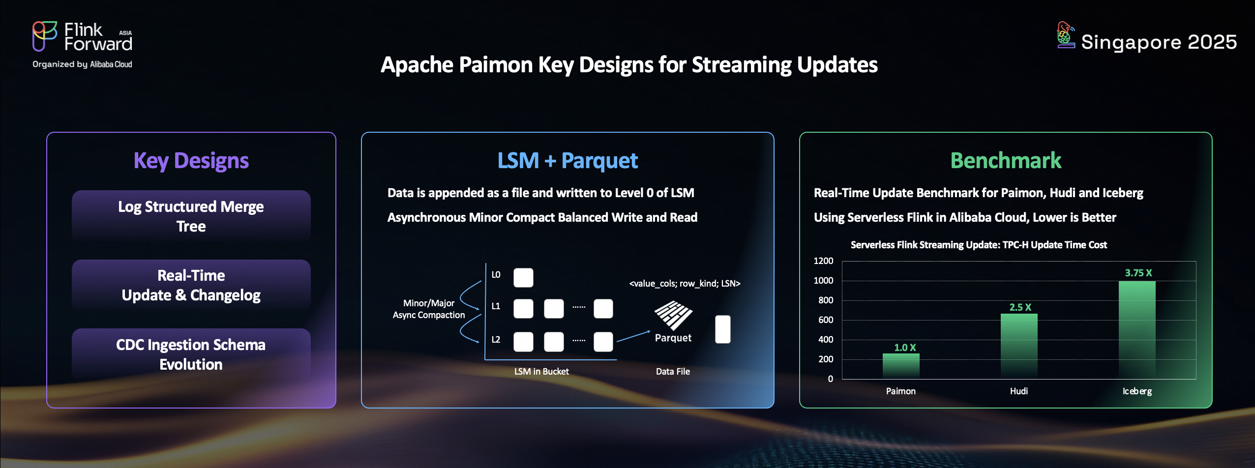 Paimon distinguishes itself as the only lake format successfully combining LSM-tree technology with data lake storage paradigms. This combination delivers write performance characteristics of real-time databases while maintaining data lake scalability and cost-effectiveness.
