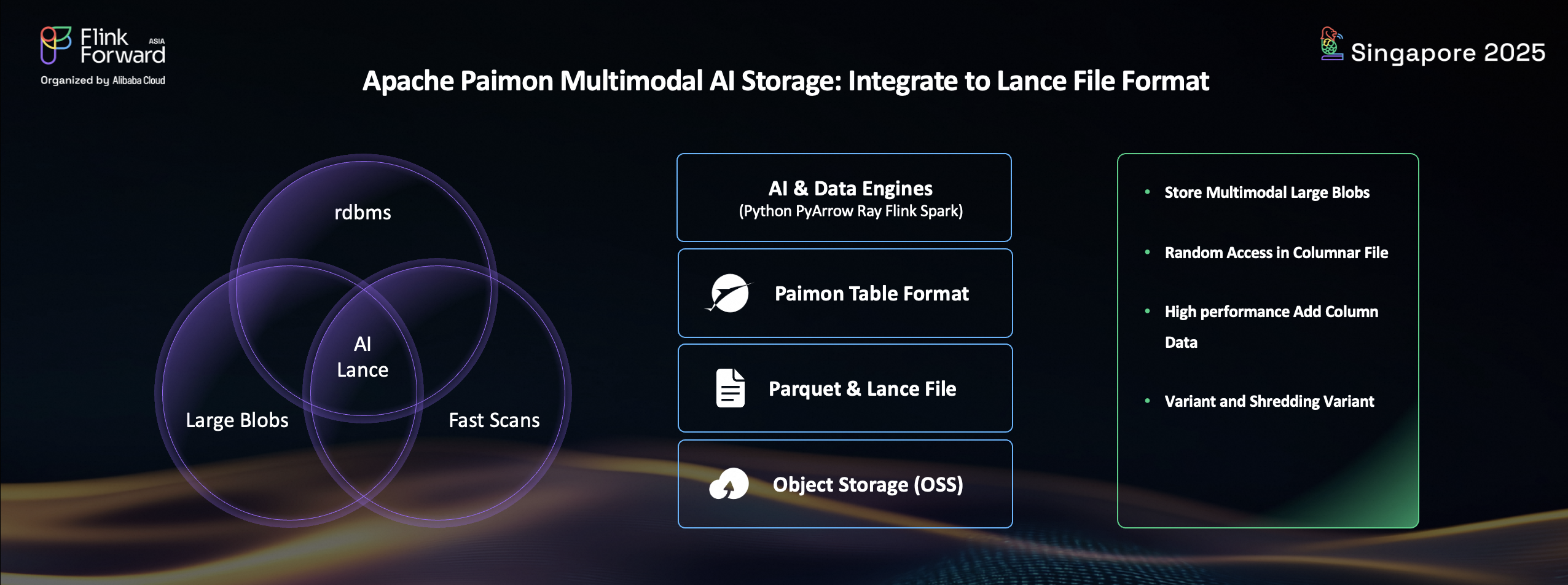 Apache Paimon's integration with Lance file format addresses multimodal AI storage requirements. Lance is specifically designed for large blob storage scenarios, providing optimized performance for AI and machine learning workload access patterns.