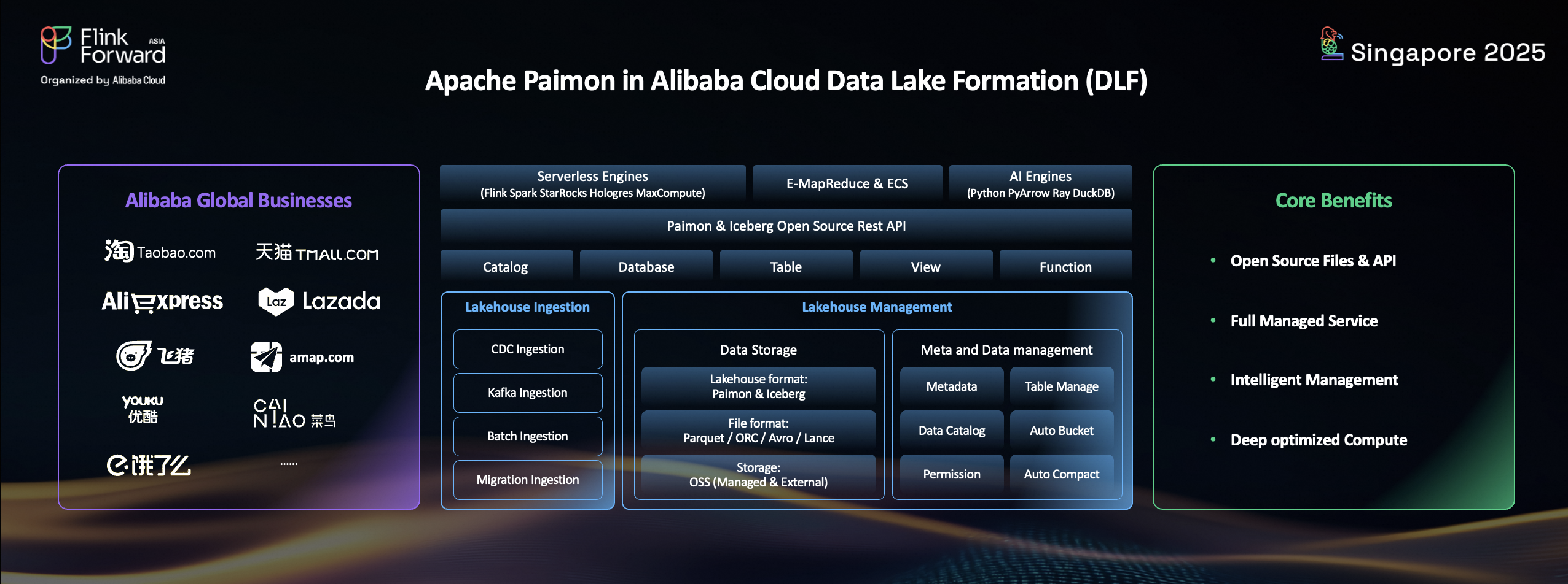 Alibaba Cloud's Data Lake Formation (DLF)platform provides comprehensive, managed implementation of Paimon-based data lake infrastructure. DLF integrates core components including Paimon as primary lake format, comprehensive metadata management, and intelligent optimization features.