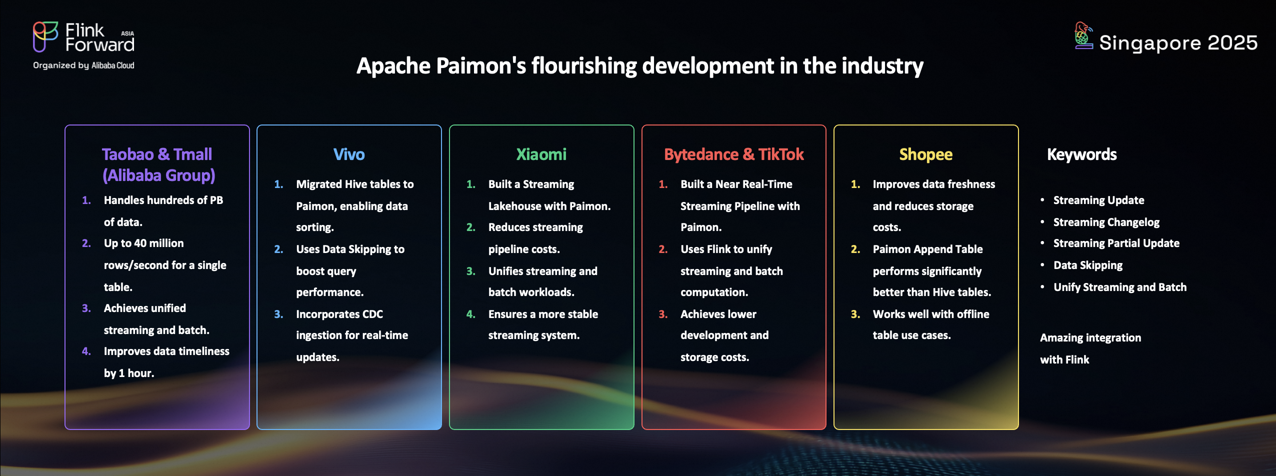 Major technology companies demonstrate Paimon's practical value through extensive production deployments that showcase its scalability and reliability under demanding conditions. These real-world implementations provide compelling evidence of Paimon's readiness for enterprise-scale deployments.