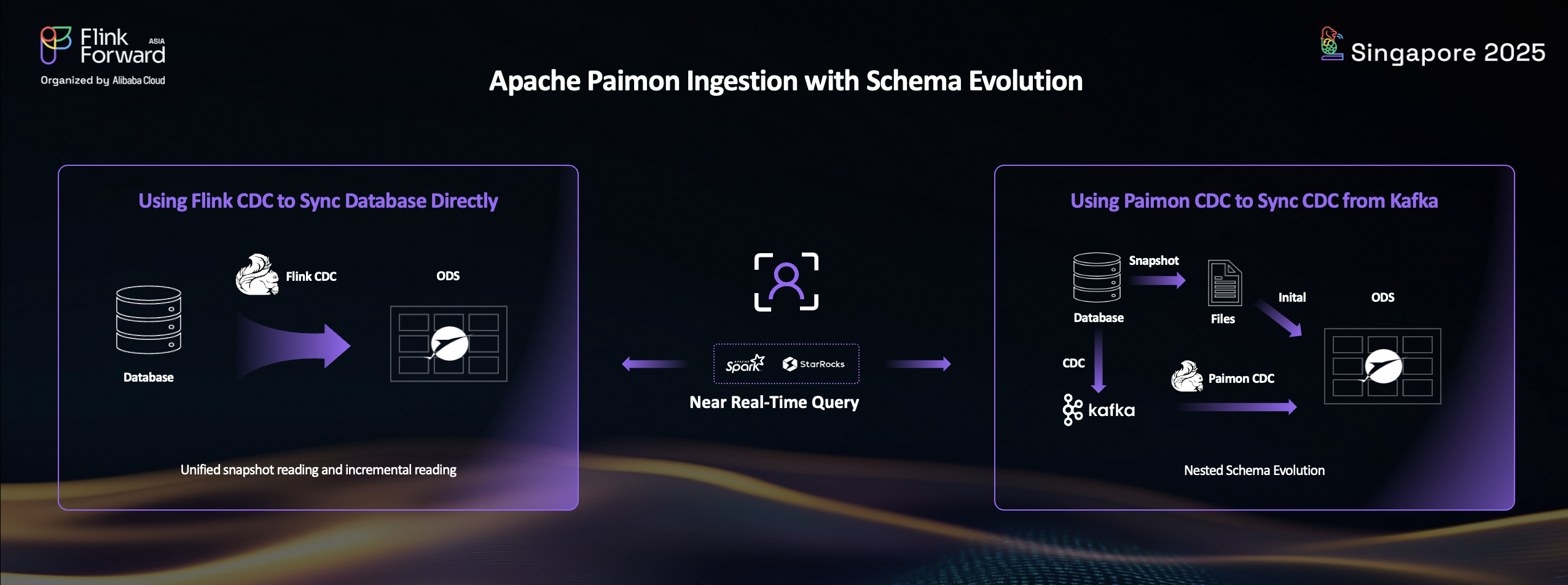 Apache Paimon provides robust schema evolution support through two complementary approaches. Flink SQL CDC enables direct streaming ingestion from database sources with automatic schema evolution, while Paimon CDC handles scenarios where data flows through Apache Kafka.