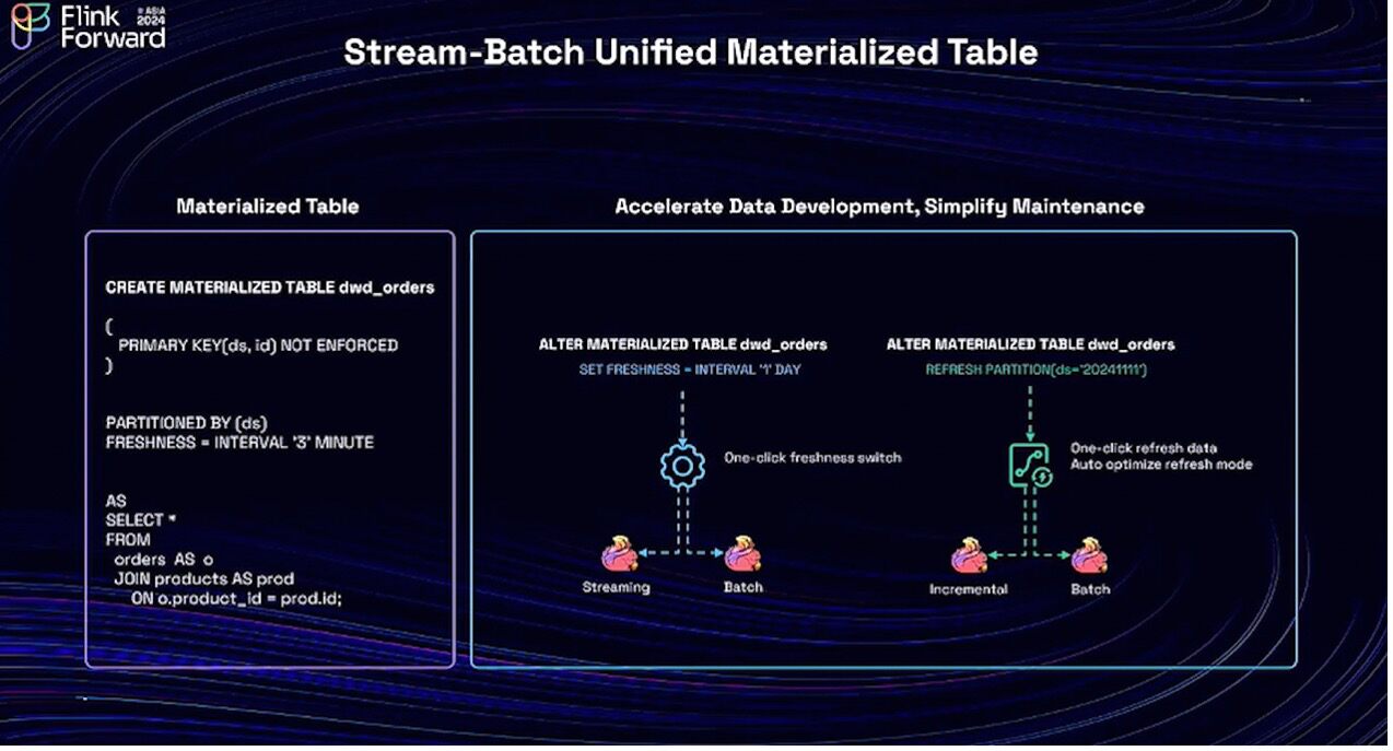 Additionally, when using Materialized Tables, users can enhance their maintenance work beyond writing just one piece of code. For example, during a promotion, we provide users with the second-level real-time data, and after the promotion ends, in order to reduce the operational costs, users can change the data freshness to day-level with a single click. Furthermore, for data backfilling, which is commonly used in data warehouses, we can also trigger it with a single command. Materialized Table not only helps users achieve writing just one piece of code, thereby improving their development and maintenance efficiency, but it also brings cost efficiency.