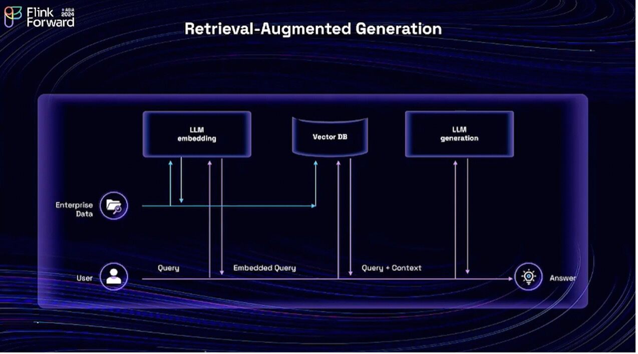 The question is: how can Flink help in this architecture? We know that Flink is effective at real-time data processing. The question can be rephrased as: Is there any demand for real-time data processing in this architecture? I believe the answer is yes. First, the knowledge base is not static and constantly updated. When updates are made to the knowledge base, we expect the results to be reflected in the generated content as soon as possible. That depends on the real-time responsiveness of the blue pipeline in this figure.