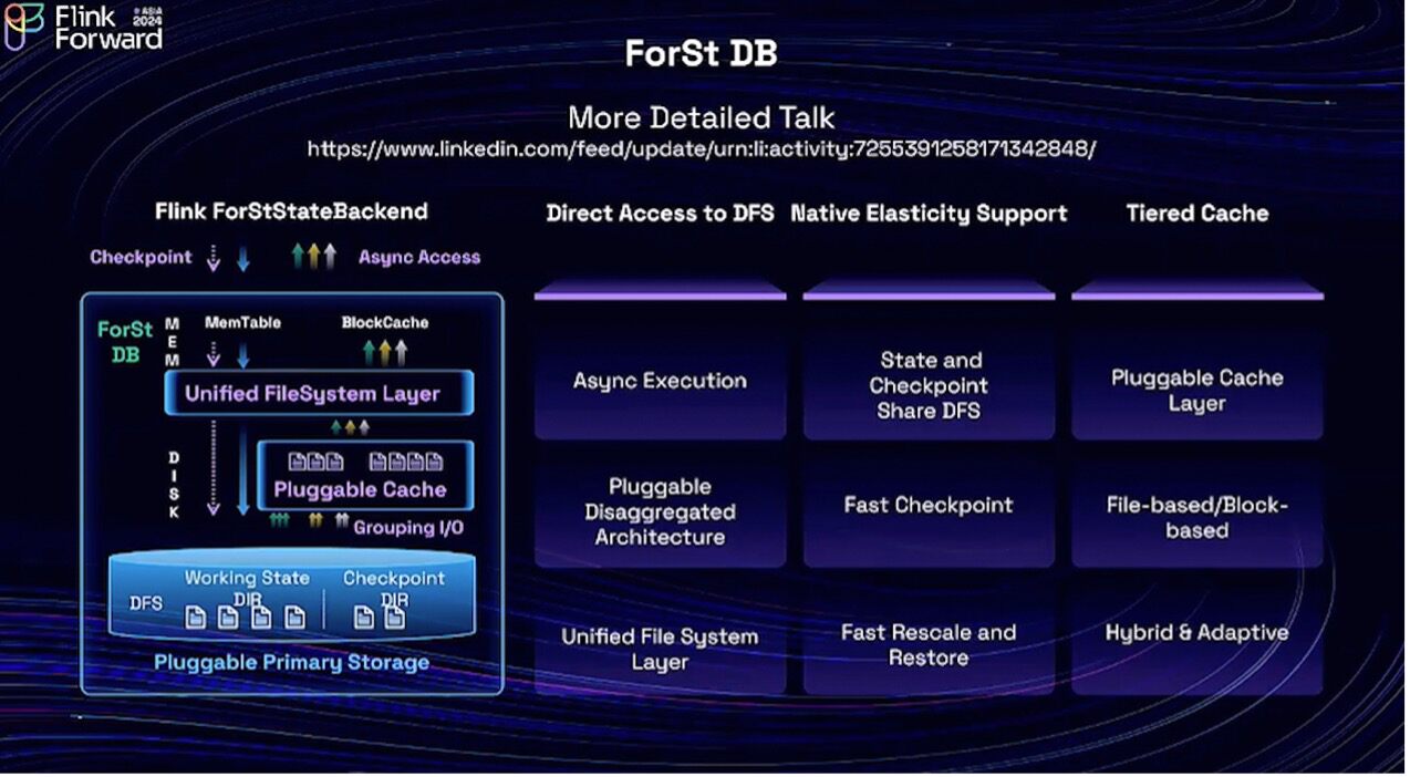 To address these challenges, we introduce ForSt DB, facilitating disaggregated state management in Apache Flink 2.0. "ForSt" stands for "For Streaming." Essentially, ForSt DB is a "For Streaming Database."It is a straightforward name that reflects its purpose well: ForSt DB. ForSt DB has already been open-sourced by Alibaba Cloud.