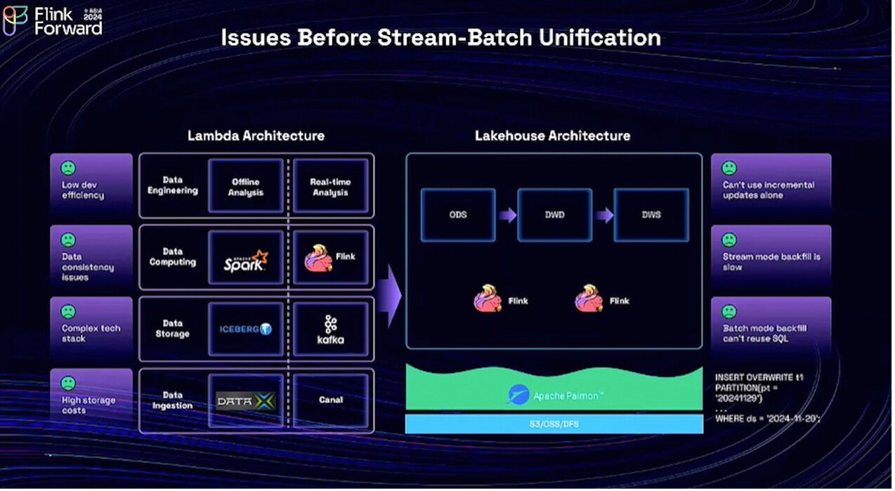 From top to bottom, we have two different tech stacks for the two pipelines. This will lead to several issues in development, such as high storage costs due to storage redundancy and a complex technical stack. Additionally, users need to develop separately for both batch and real-time development, which may cause potential inconsistency.
