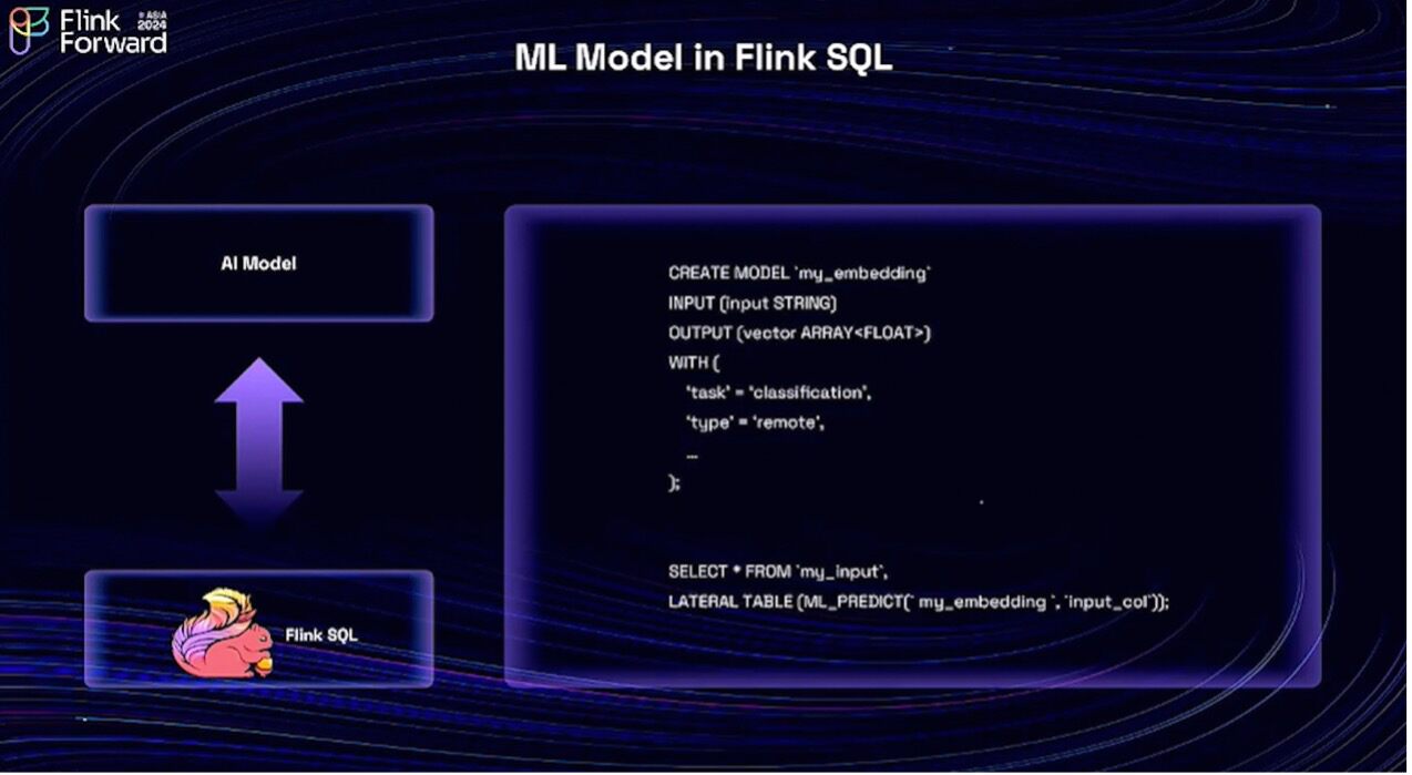 Now Flink's users can just use Flink SQL to create a model, similar to creating a catalog. We can define the input and output data structures of the model as well as any model-specific arguments. Once the model is defined, we can simply use it within Flink SQL, like invoking a function or a table function. This will help integrate the model invocation with data processing and the validations before and after the model invocations. The design has already been approved by the Flink community and is currently under development.