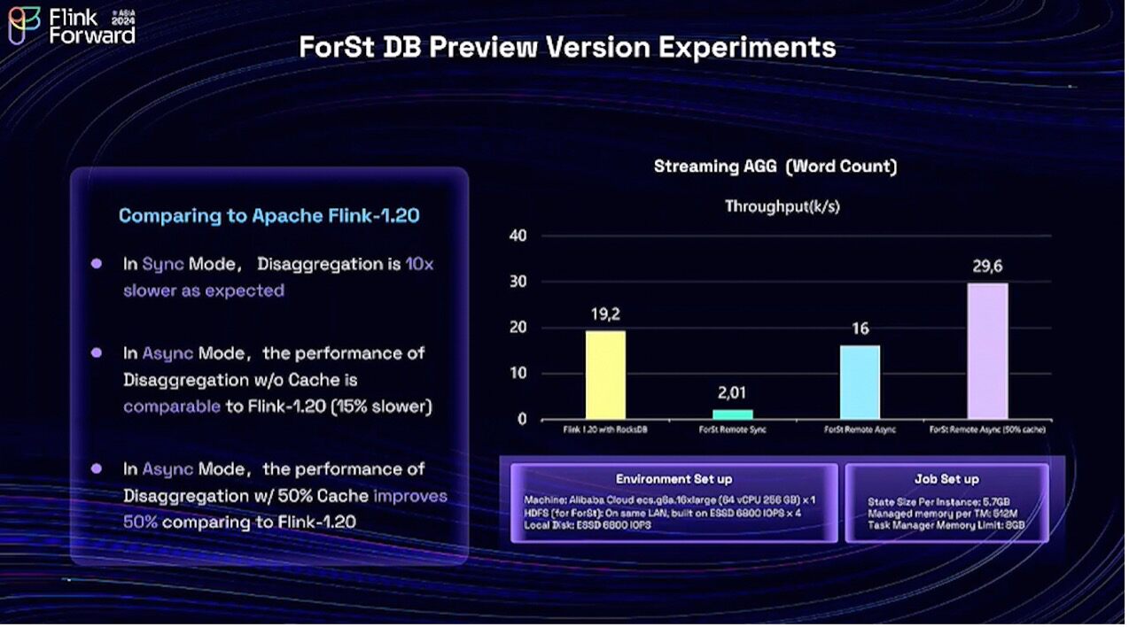 To wrap up this section, let's look at some exciting results from our ForSt DB preview version, as shown above. These experiments compare ForSt DB with the latest Flink 1.20 release.