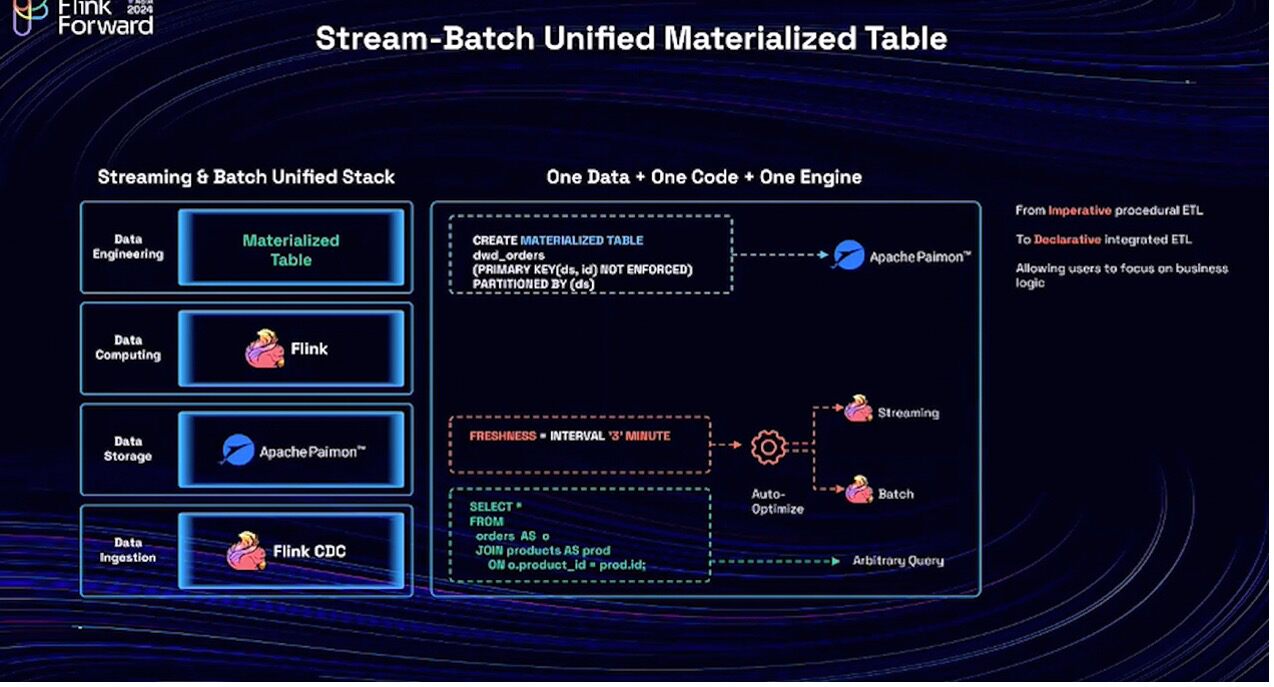 In certain scenarios where we utilize Paimon as a dimensional table, we have implemented numerous enhancements to improve its functionality. For example, we have improved the performance of Flink's Lookup Join with respect to the data distribution inside Paimon. To address the single key data skew problem, we have supported the Flink skew join optimization. There is also a new feature called a Proc-Time Temporal Join in Flink, which can be used in some use cases to replace the Lookup Join, especially in scenarios where the dimensional table is not frequently updated, and it can also reduce computational costs. We are also supporting some new emerging stream-batch unification scenarios, such as data synchronization with Flink CDC and Materialized Tables, which Lincoln just introduced.