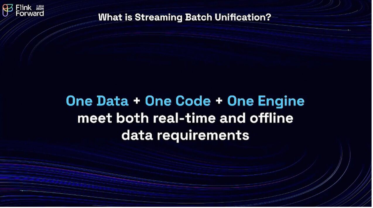 Thanks for Yuan's great talk. I'm Lincoln, and I also come from Alibaba Cloud. Now let's talk about the Streaming Batch Unification. What exactly is the Streaming Batch Unification? From a data engineering perspective, we can summarize it in one sentence: writing and storing just one set of data and one piece of code to meet both real-time and offline data processing needs. One code also implies the requirement for the unification of execution engines. Even when using SQL as a user API, we still have differences across various dialects. Thus, the most straightforward way to develop just one piece of code is to use a single engine.