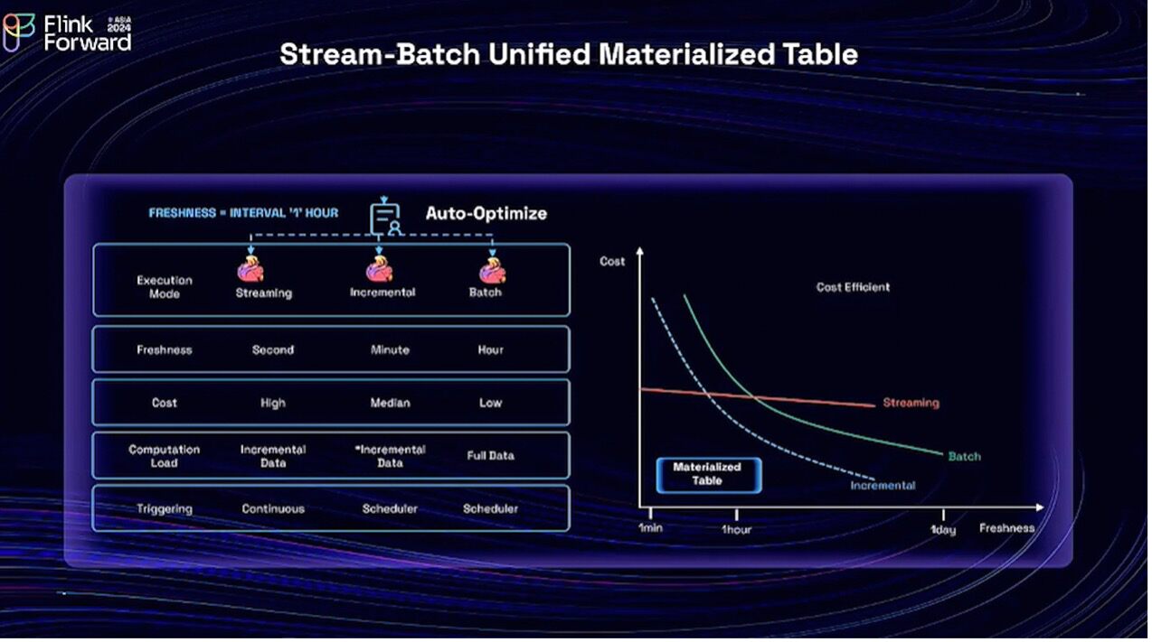 Materialized Tables support three different refresh modes: streaming mode for continuous refresh, batch mode for full refresh, and incremental refresh. Looking at the cost curve on the right side: