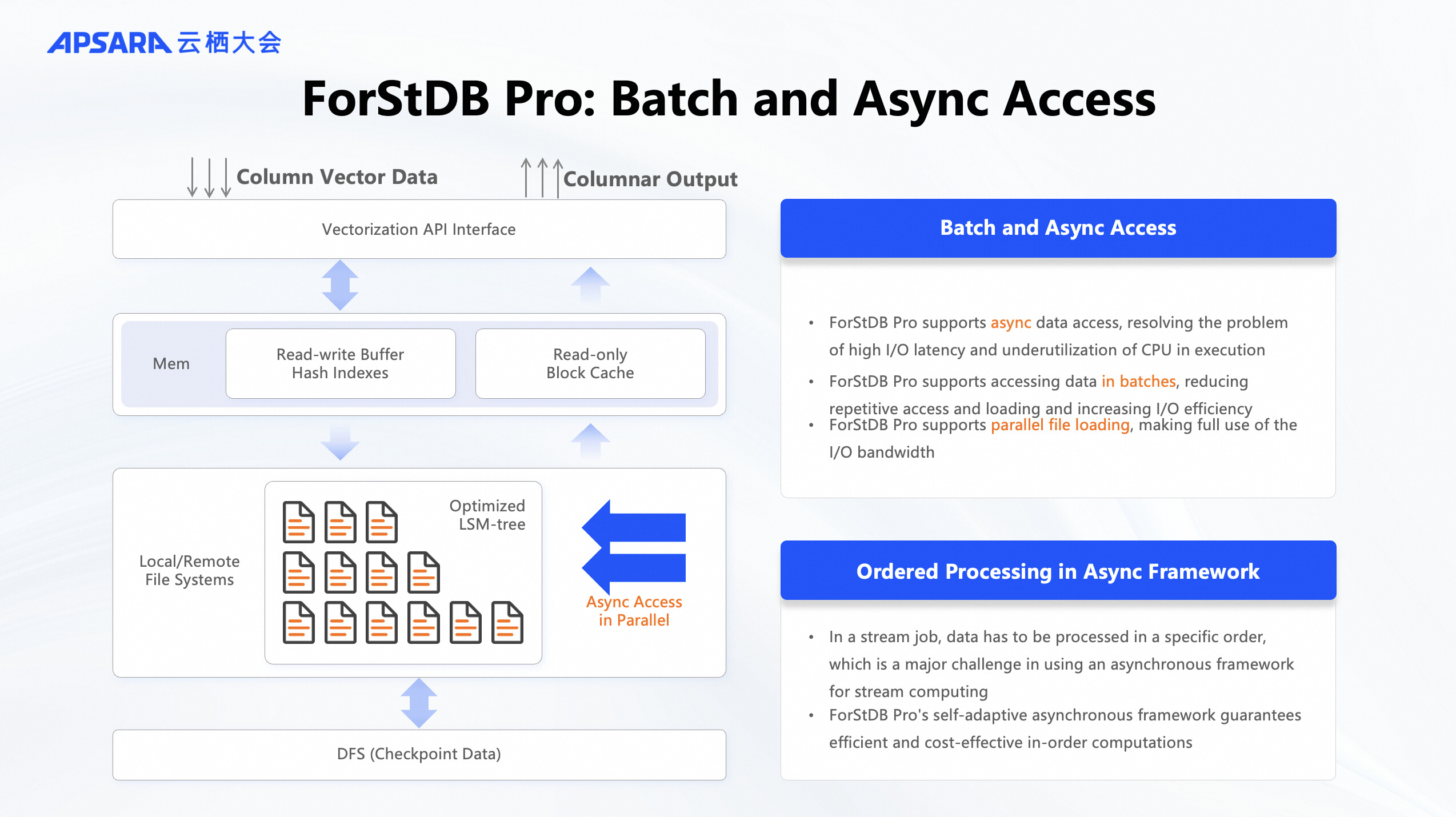 The Pro version faces greater challenges due to the need to manage extremely large state datasets, which require both memory and disk storage. When the state data exceeds available memory, performance can be significantly impacted. Therefore, we have introduced asynchronous I/O capabilities, enabling asynchronous operations alongside existing vectorization and batch processing. We have also customized and optimized the Log-Structured Merge-Tree (LSM) architecture to leverage the characteristics of stream processing. This combination of asynchronous I/O and parallel processing accelerates state data access and improves overall efficiency.