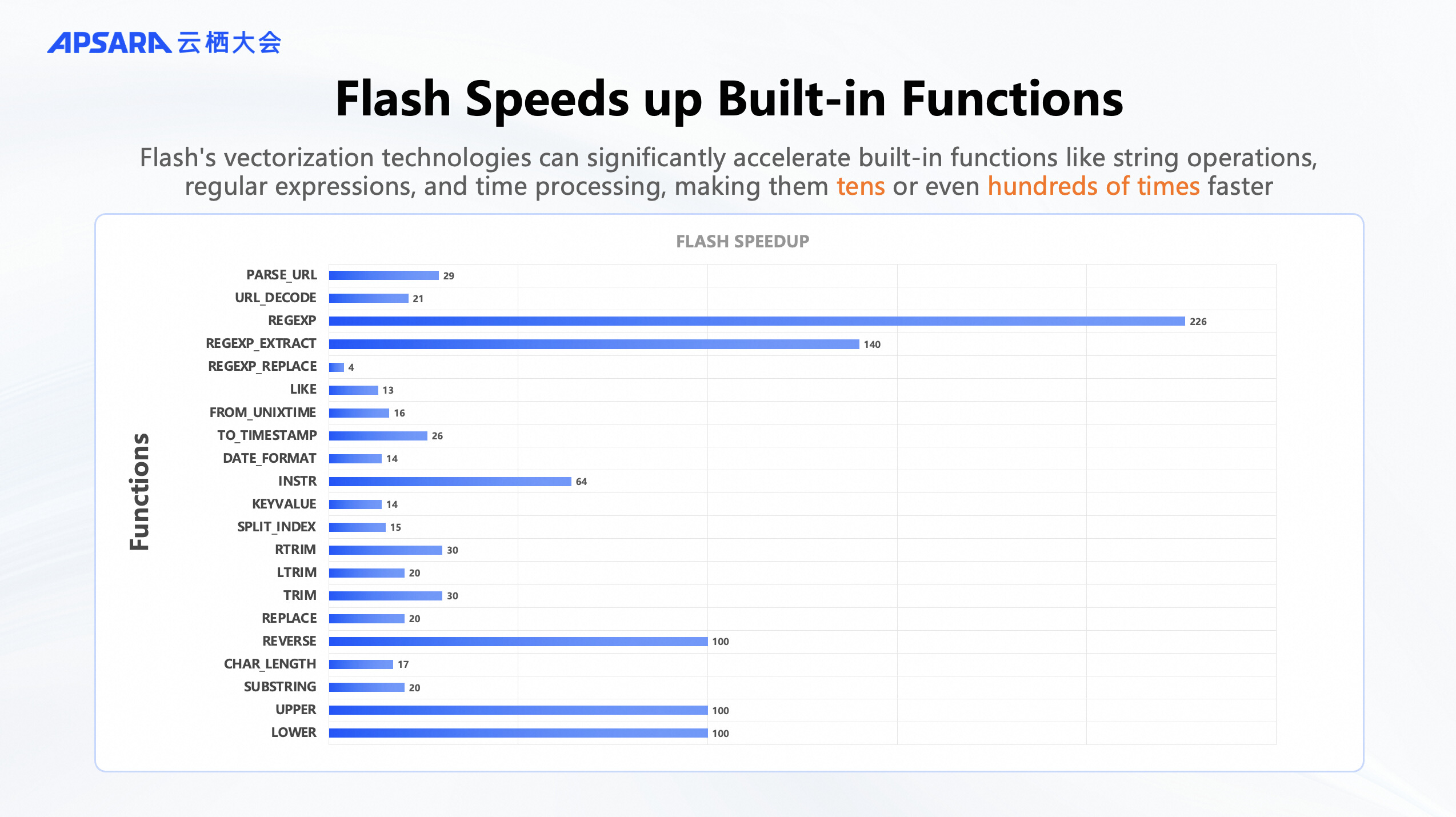 Leveraging SIMD instructions allows us to process multiple records concurrently, accelerating even single-record operations like string parsing and comparison. Vectorization enables simultaneous comparison of all data, significantly boosting computational efficiency. This parallels the benefits of batch processing. Applying this approach to Apache Flink, we optimized frequently used built-in functions, particularly those for string and time processing. These optimizations yielded performance improvements of tens or even hundreds of times. This stems from both the advantages of C++ and the efficiency gains of vectorized execution.