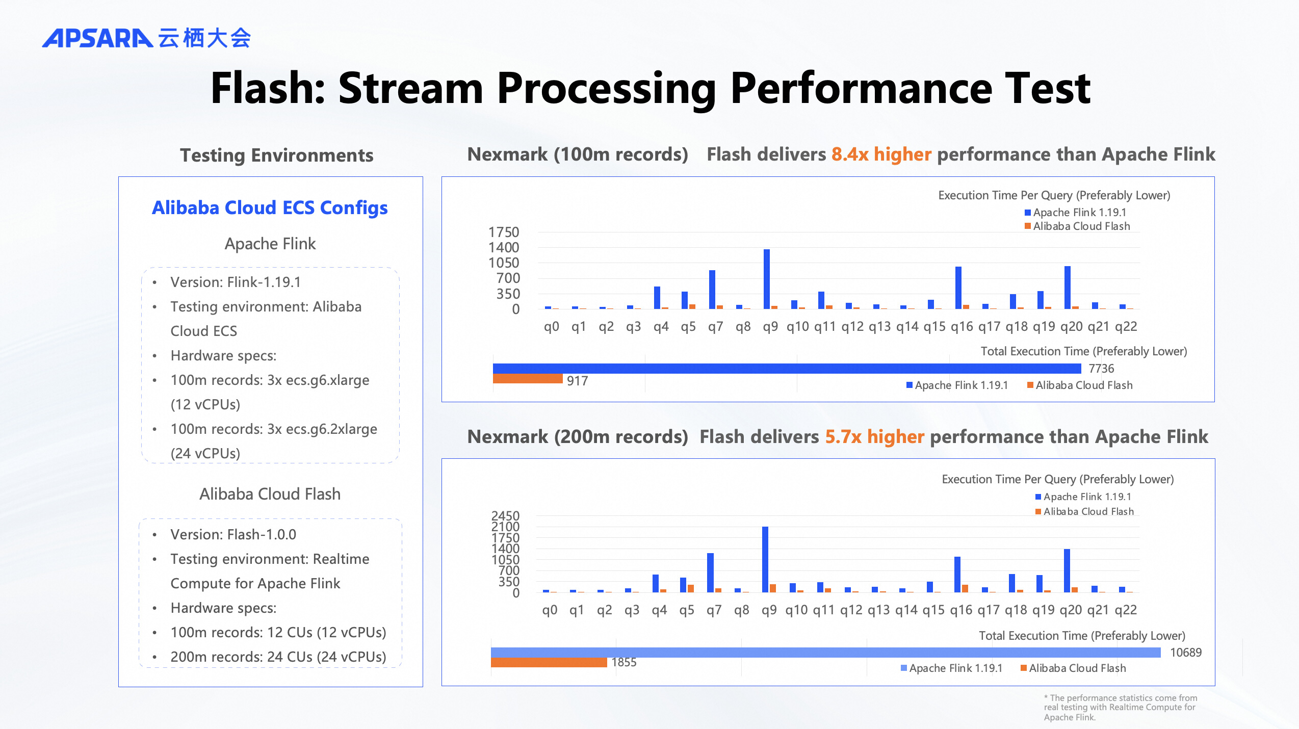 We used the open source Nexmark benchmark to evaluate performance. Nexmark is a widely recognized stream processing benchmark available on GitHub. We compared Flash 1.0 with the latest open source Apache Flink 1.19, both running on Alibaba Cloud. Open source Apache Flink was deployed on Elastic Compute Service (ECS) instances to simulate a user-managed environment, while Flash 1.0 ran on our fully managed serverless platform, using the same number of compute units (CUs). This ensured a fair comparison with equivalent hardware resources.