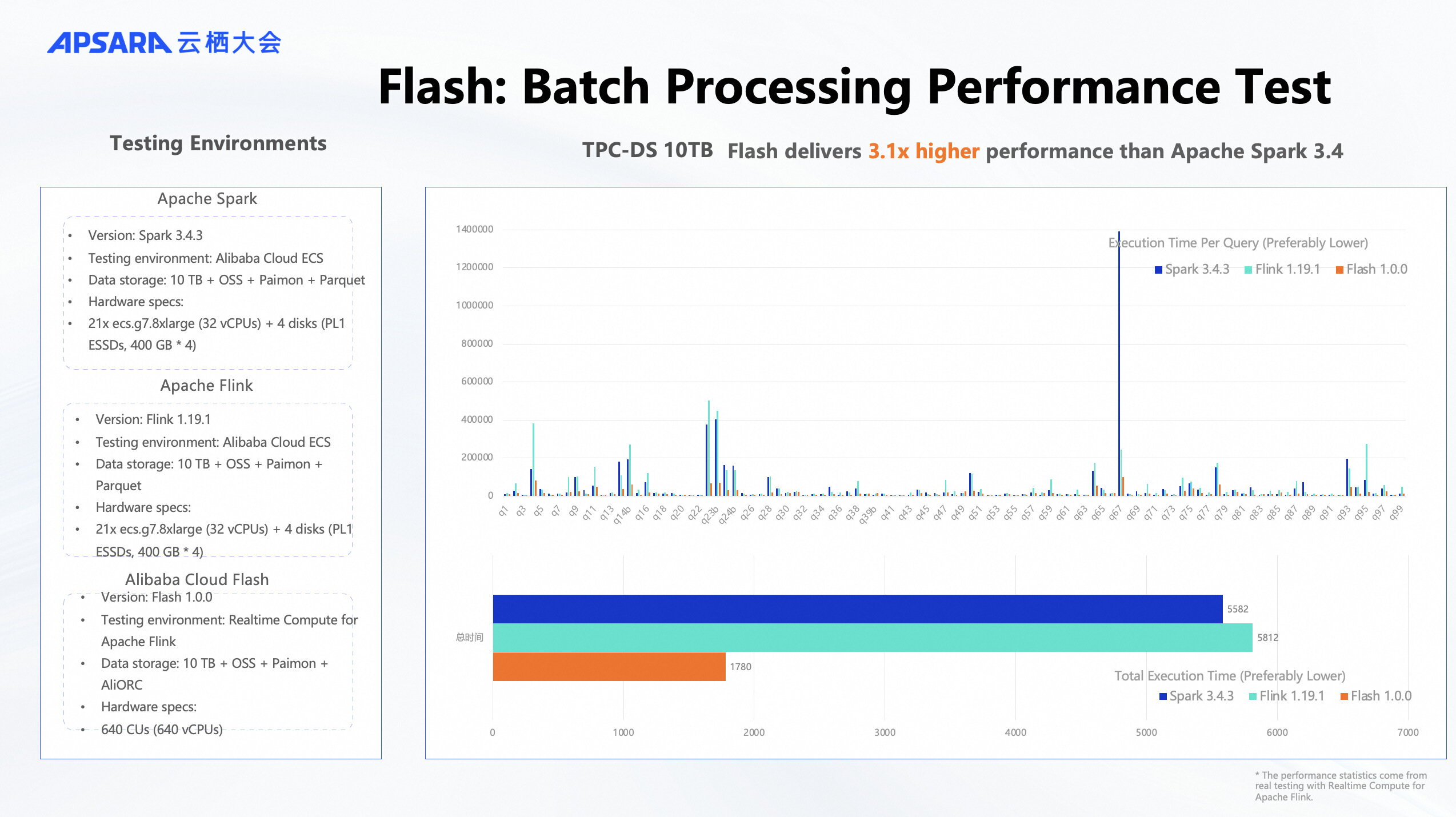 As mentioned at the beginning, Apache Flink, a widely recognized and de facto standard stream-batch unified engine, excels in stream processing. Its execution engine also brings significant advantages to batch computing by leveraging performance optimizations from stream processing. We benchmarked batch performance using the TPC-DS benchmark with a 10 TB dataset on ECS instances. Maintaining a consistent testing environment and procedure, we compared open source Apache Flink 1.19 and Apache Spark 3.4 against our product, utilizing the same number of CUs. Results demonstrate that our product outperforms both open source Apache Flink and Apache Spark by over 3x, even in batch processing scenarios. These results are reproducible and verifiable. These stream and batch processing benchmarks demonstrate the significant performance and cost-effectiveness advantages of our C++ vectorized Flash engine compared to purely open source solutions.