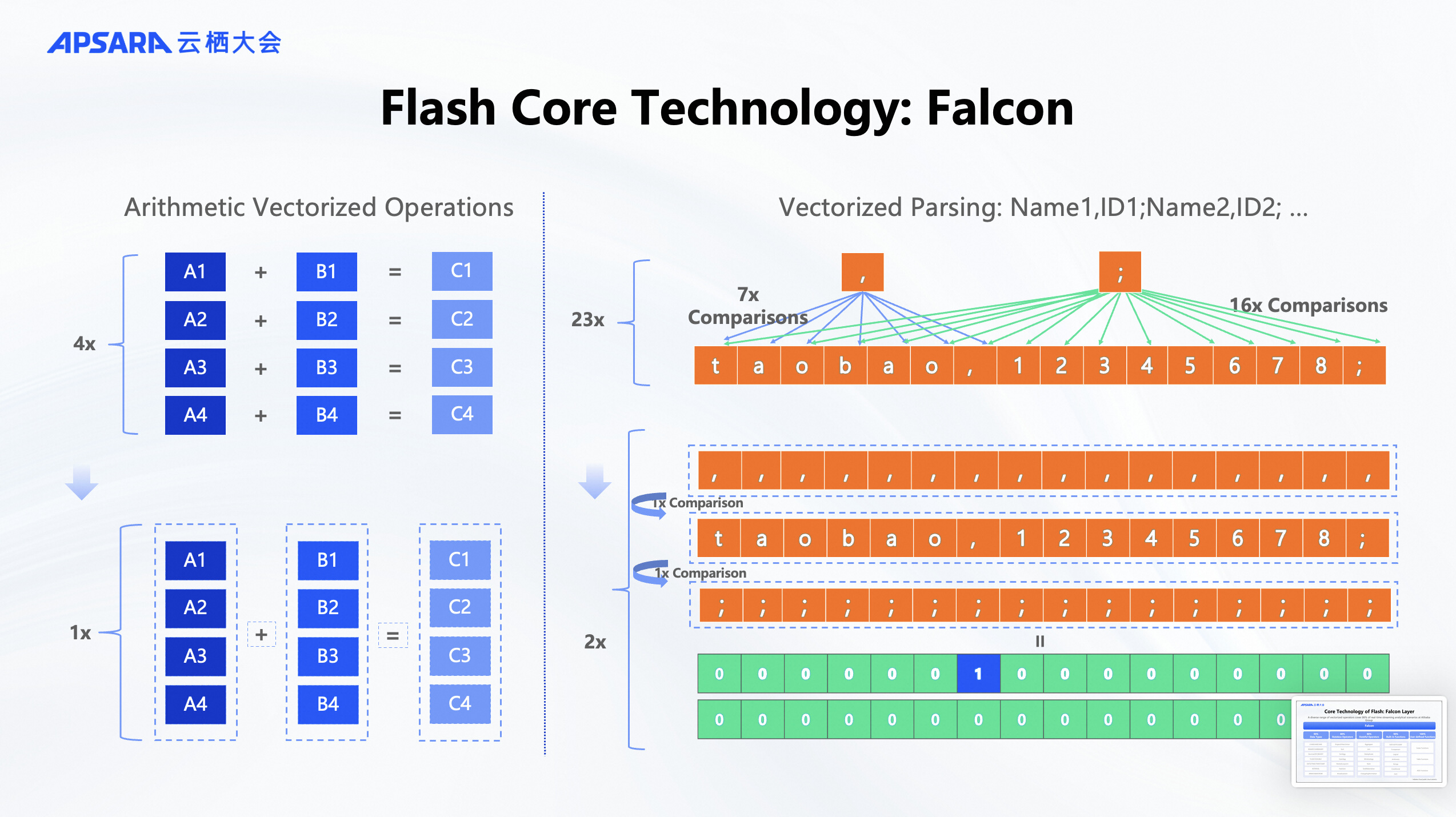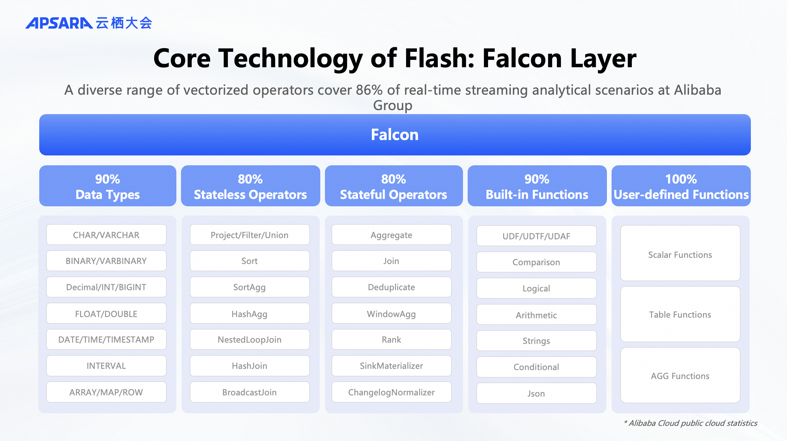 Within the Falcon layer, we reimplement numerous built-in data types, time functions, and string processing functions in C++. All operators operate in a vectorized fashion, leading to computational improvements. Based on analysis of internal streaming analytics workloads within Alibaba Group, the Flash engine currently is able to cover over 80% of use cases. This indicates coverage of the majority of computation and arithmetic logic. We are actively developing the remaining operators to address a broader range of stream processing requirements.