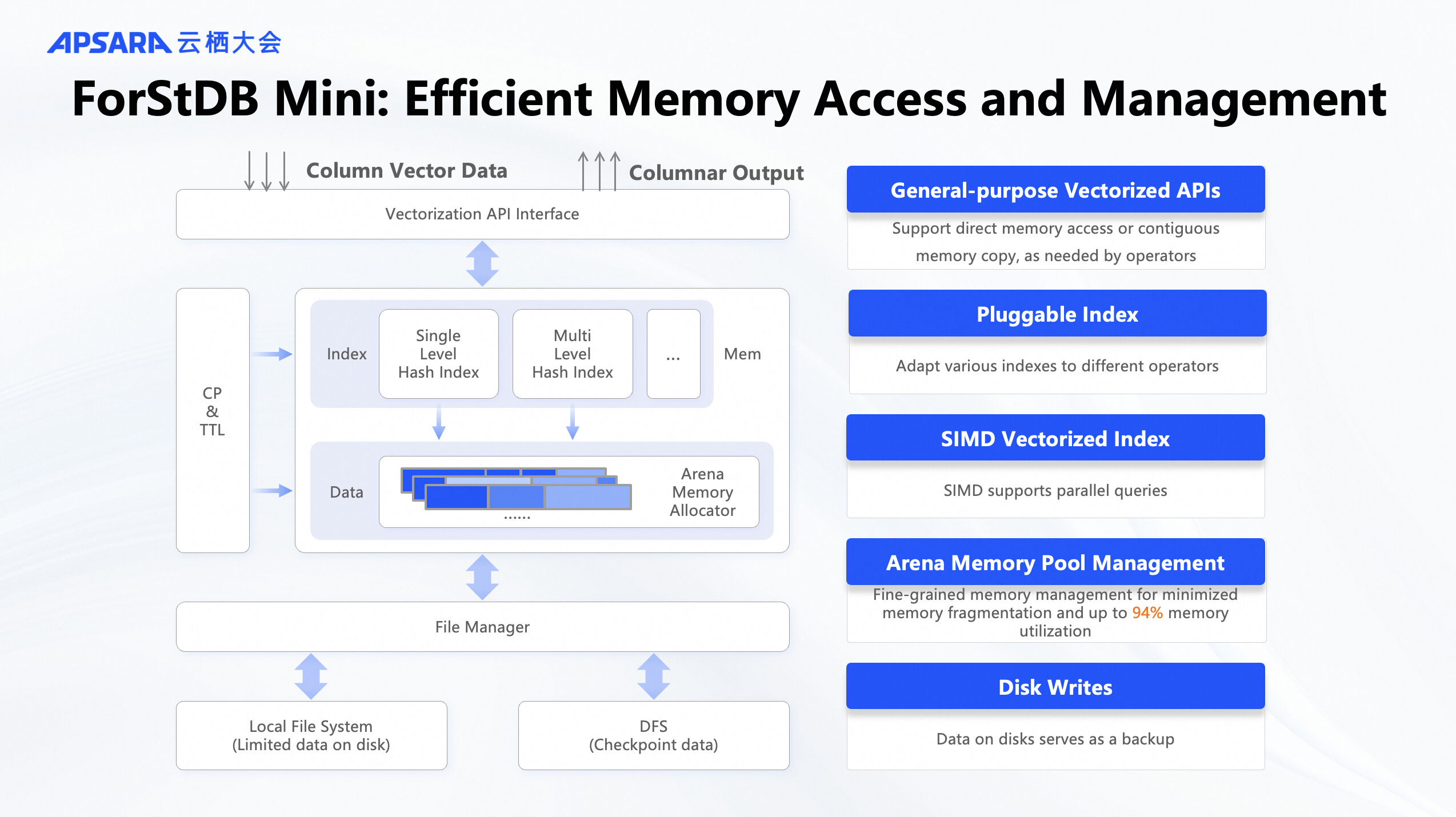 ForStDB Mini is an in-memory state store designed for statistics such as PVs and UVs. It utilizes a vectorized interface and batched output for all data access to increase throughput. Its performance relies on a modern index structure, similar to a large hash index, which facilitates both single and parallel lookups using SIMD. This gives it a significant performance advantage over traditional key-value stores and even outperforms the in-memory state backend of open source Apache Flink, especially in Java environments. Built entirely in C++ with arena-based memory pool management, ForStDB Mini offers superior memory efficiency compared to Java-based solutions. This makes it a production-ready, high-performance solution for state storage.
