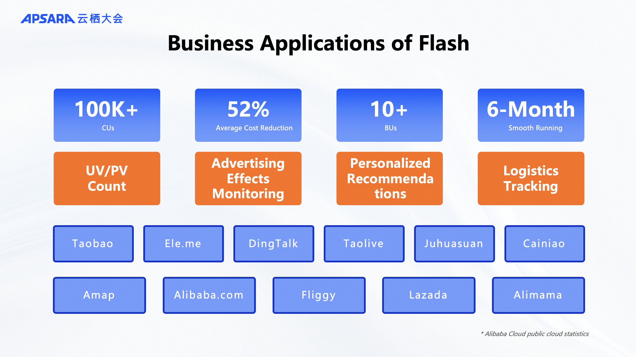 Beyond theoretical and Benchmark results, we will share the real-world busniness applications on the Flash engine from Alibaba's production environment. Since the beginning of this year, Flash engine has been gradually launched within Alibaba, through continuous online refinement and iteration. Till Sept., Flash has covered over 100,000 CUs worth of experimental services within Alibaba. The production traffic covers main business scenarios of Alibaba, including Tmall, Cainiao, Lazada, Fliggy, AMAP, and Ele.me. Business applications involve scenarios such as user PV and UV statistics, business intelligence (BI), advertisement performance monitoring, personalized real-time recommendations, and order and logistics tracking. The results demonstrate a 50% cost reduction for participating business units.