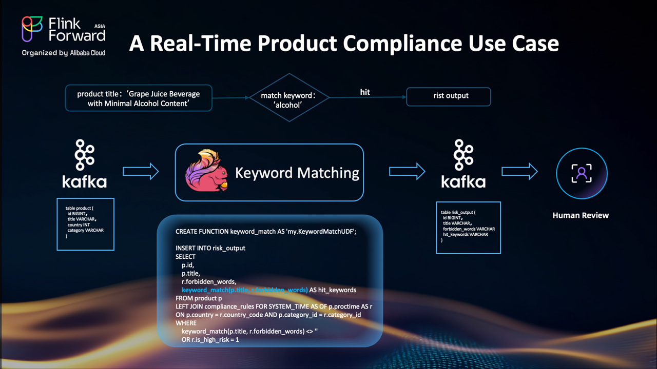 Let’s bring it all together with a concrete example. Here’s how Flink AI functions solve our product compliance challenge: