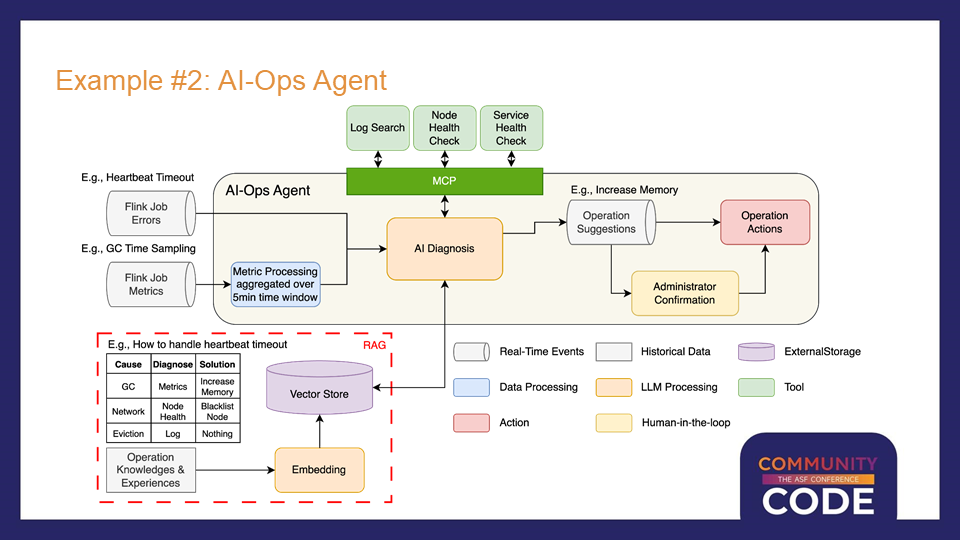 Flink Agents, currently in development, aim to address these gaps by introducing AI-driven, event-based decision-making. On top of rule-based automated operation, the system can delegate diagnostic tasks to AI. AI can utilize RAG technology to query operational knowledge bases, apply accumulated expertise to select appropriate diagnostic steps (e.g., log searches or node health checks via tool invocations), and execute low-impact actions autonomously. For high-impact operations, AI can trigger human confirmation before execution.