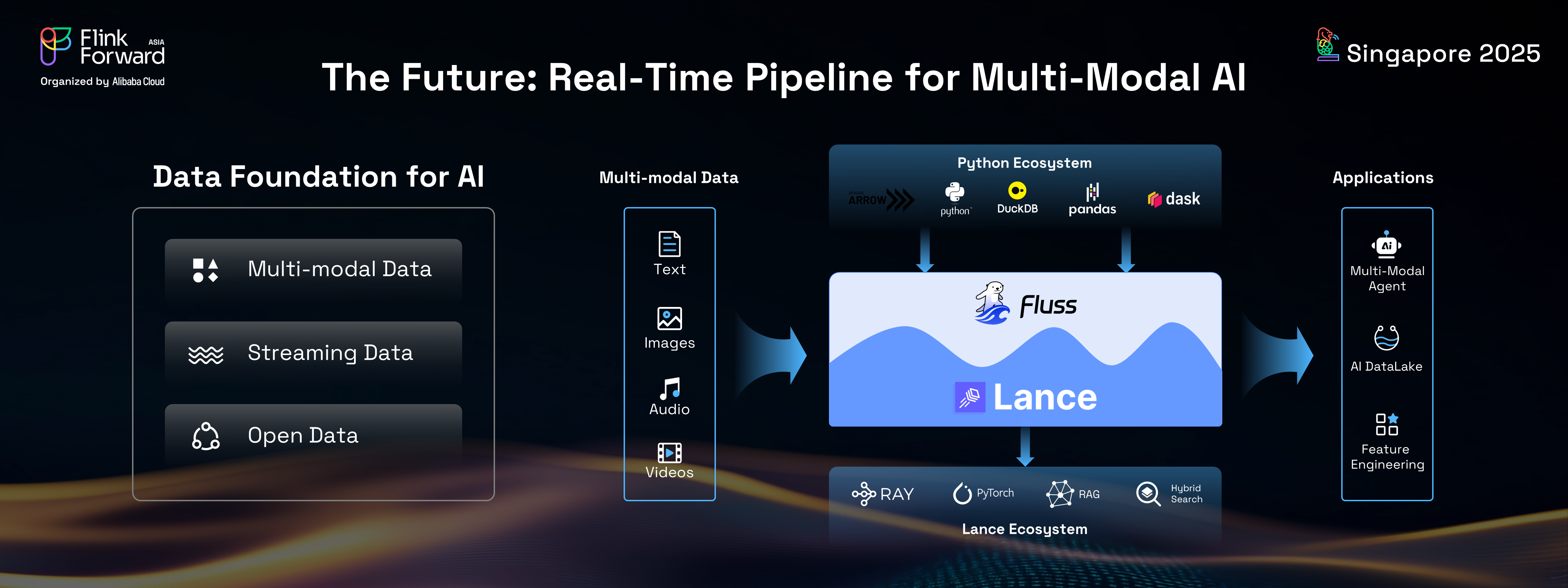 This will involve supporting real-time ingestion and storage of multimodal data in a streaming format, and then seamlessly converting it into the Lance format. From there, users can connect to the broader Lance ecosystem, including tools like Ray and PyTorch. With the upcoming Fluss Python client, integration with the Python data science ecosystem (Pandas, Polars, etc.) will unlock a multitude of use cases, such as real-time multimodal agents, real-time AI data lakes, and real-time feature engineering.