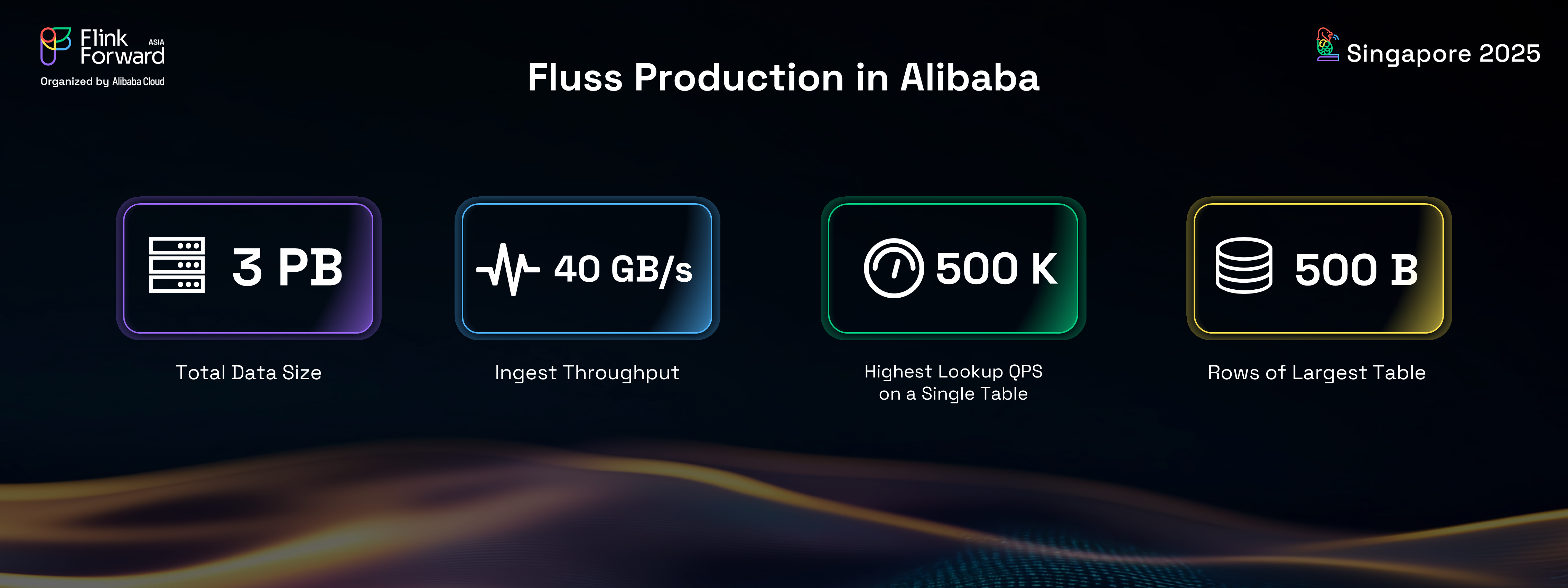 Currently, Fluss manages over 3 PB (petabytes) of data in total, with clusters handling an impressive ingest throughput of 40 GB per second. Furthermore, it supports very high-performance KV lookups, reaching up to 500,000 QPS (queries per second) on a single table, with the largest table containing over 500 billion rows. These statistics underscore Fluss's capability to handle massive data volumes and high-velocity data streams.