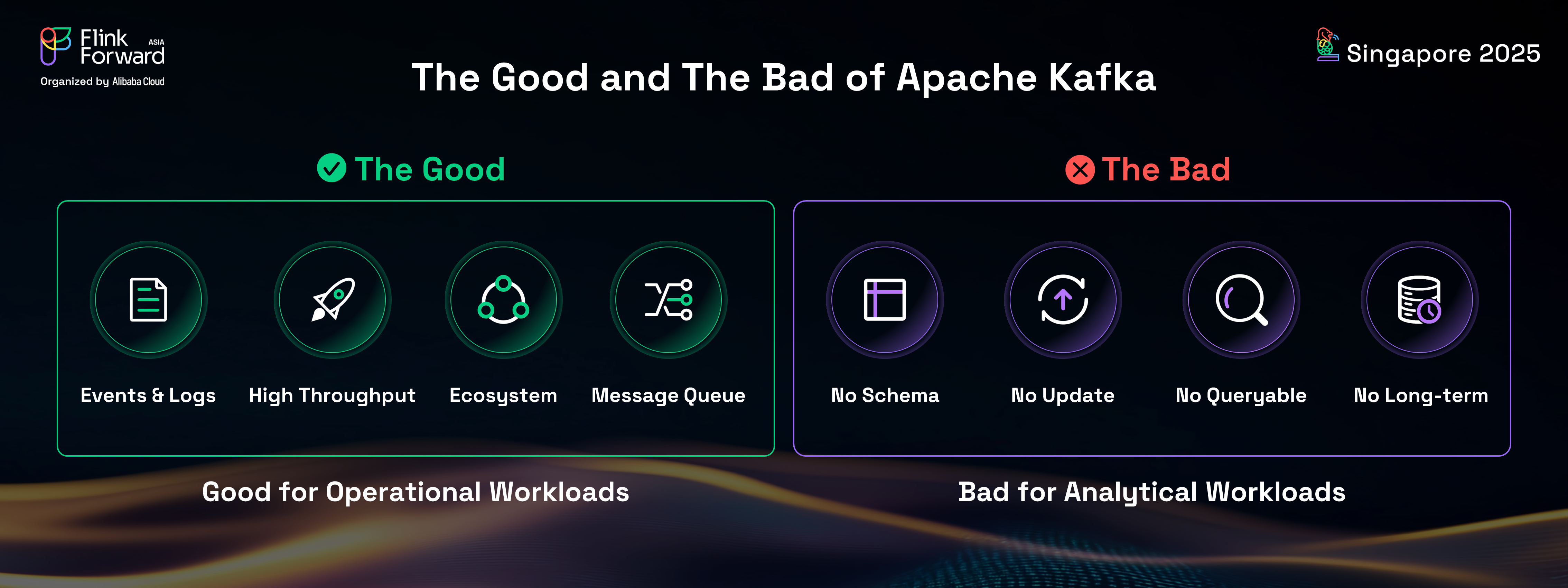 They are not designed for querying, lookups, or long-term data retention, acting merely as a black box in the data pipeline. This isn't a fault of Kafka itself, but rather a misuse of its capabilities. Kafka is optimized for operational workloads and event-driven communication, not for the demands of analytical and AI applications. Its lack of built-in schema, absence of update support, and poor optimization for long-term data storage limit its utility in modern data warehouses and analytical use cases.