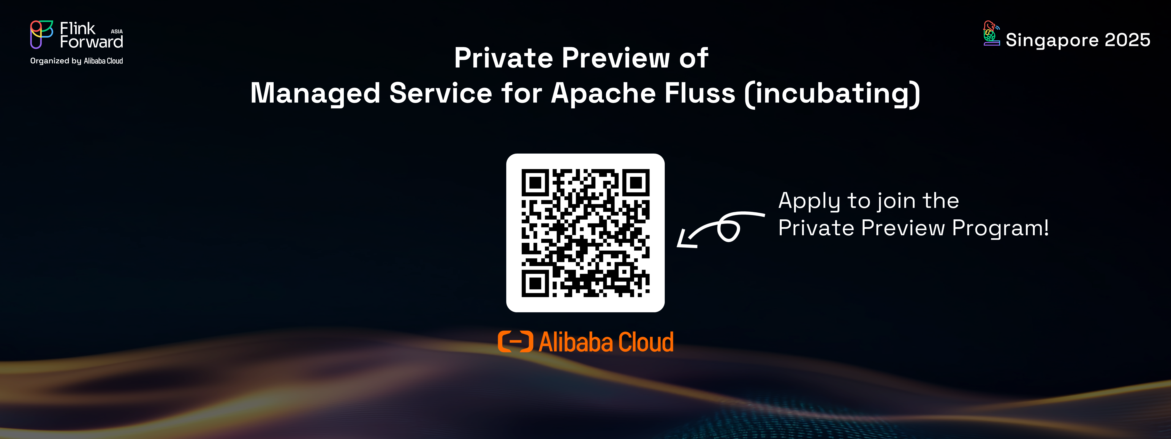 Finally, a private preview of the managed service for Apache Fluss (incubating) has been launched on Alibaba Cloud, now available in the Singapore region. This offers an opportunity to explore the next-generation streaming storage. Users can apply for the private preview program of the managed service for Apache Fluss (incubating) on Alibaba Cloud by visiting this link or scanning the QR code in the slide below.