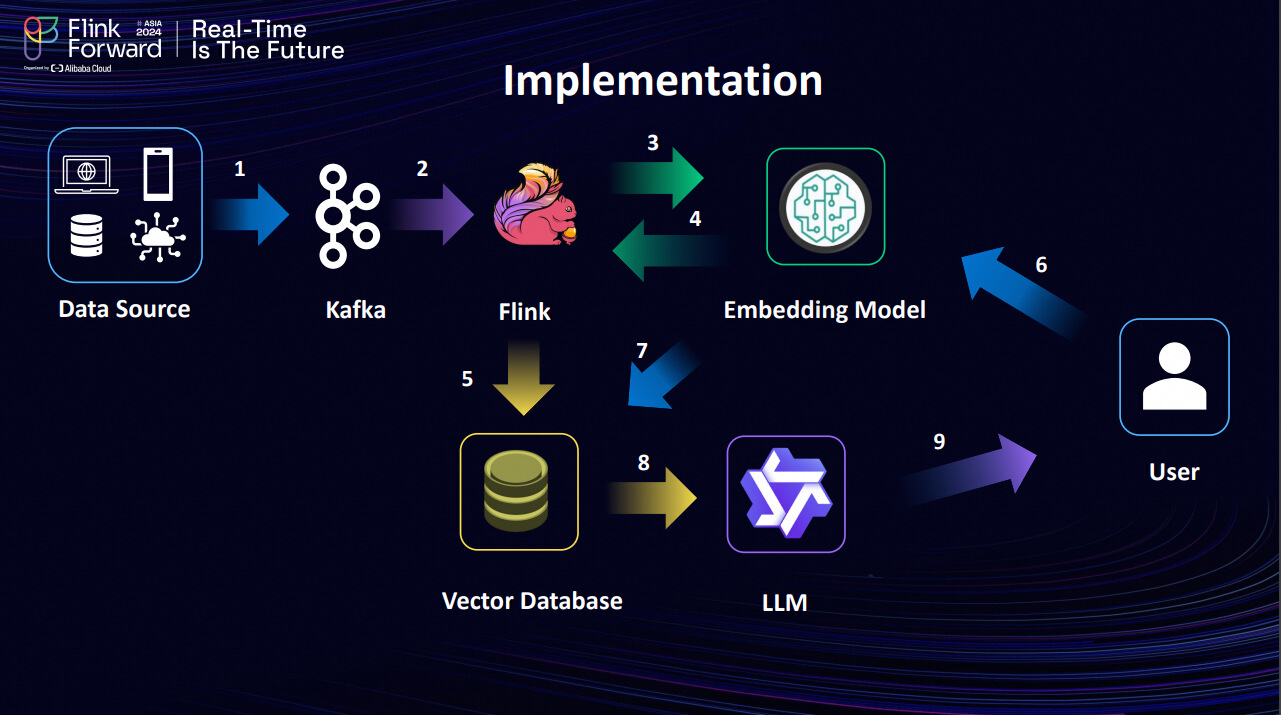Now that we have reviewed the components, let's discuss the flow and architecture we aim to implement, particularly focusing on streamlining live, real-time data. The data will be sourced from various points and then framed through Kafka, which will send the topics to Apache Flink. As mentioned in the previous talk, the asynchronous I/O data inputs will be sent to the embedding model.