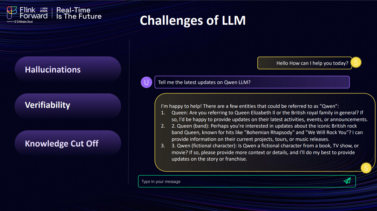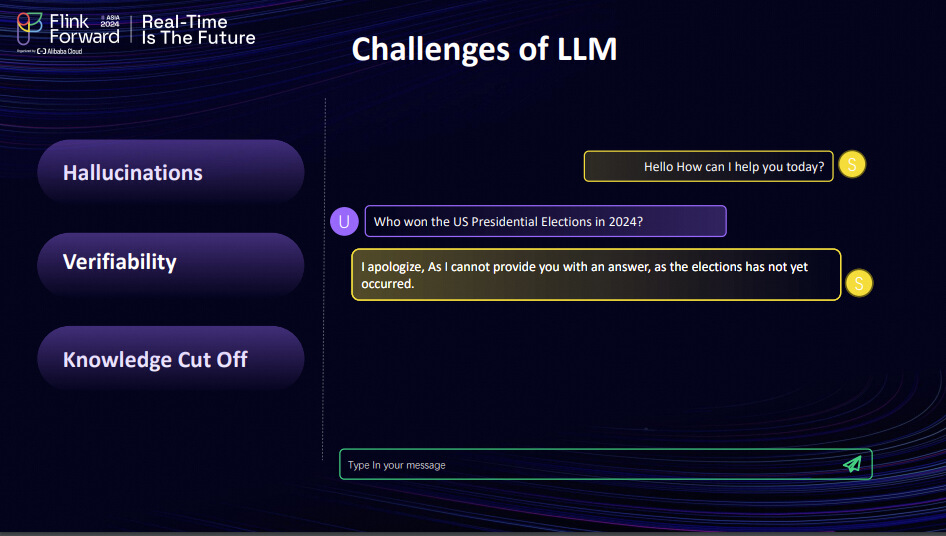 The second challenge involves verifiability. Without real-time data, LLMs are unable to accurately answer contemporary queries. For instance, when I inquired about the winner of the 2024 U.S. presidential election, the LLM could not provide an answer due to its data limitations. Sometimes, it might even claim that the election hasn't occurred. We aim to develop solutions to address these issues. I believe Ashish is the right person to provide an introduction to potential solutions.