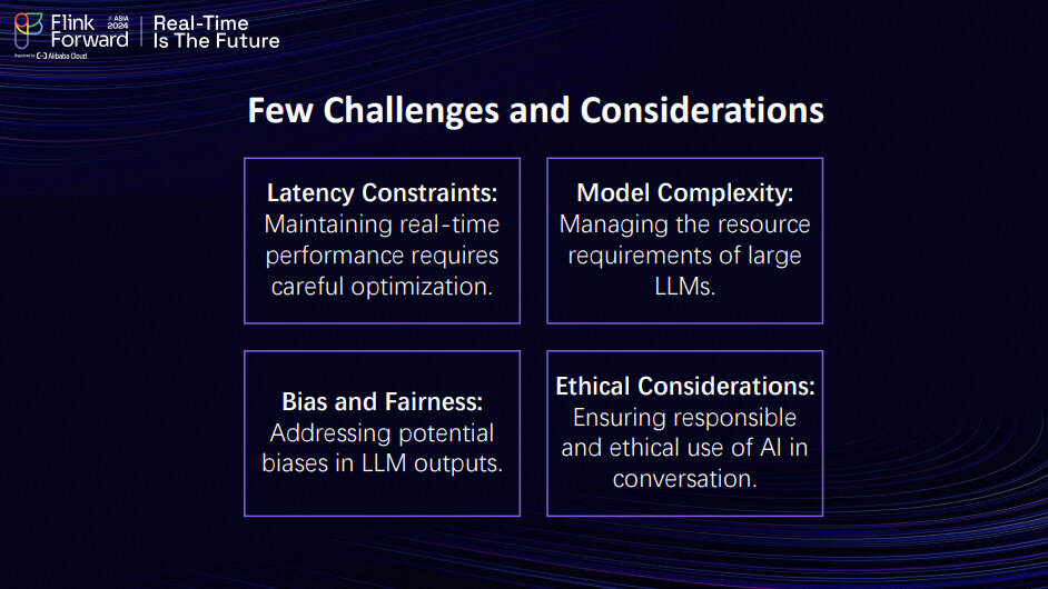As members of the open community, we considered latency because each module has different response times and inference levels. Given this, we need to account for these variations, especially when running multiple instances simultaneously with large data sources. This situation often leads to issues with model complexity. Additionally, if you fine-tune the model for a specific set of instructions, there is a risk of bias and overfitting. Another critical aspect is ethical considerations. It is essential to have guardrails in place to ensure that the model stays within its intended context and that real-time data is not misused.