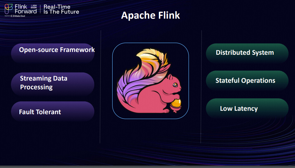 I believe everyone in this room is familiar with Apache Flink. Apache Flink is an open-source framework driven by the community, which supports both batch and real-time data processing. It can handle large volumes of data and provides low latency, making it a very efficient tool. For those who might not be familiar with Apache Flink, this event is an excellent opportunity to learn about it. There will be tech talks later where you can dive deeper into its functionalities.
