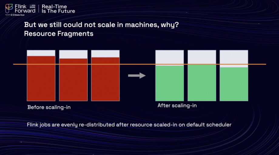 After applying their autoscaling rules to the cluster, the team noticed a reduction in overall resource usage. However, they found themselves unable to reduce the number of machines in use. The issue arose from the default Kubernetes auto-scheduler, which evenly redistributes Flink jobs following resource scale-ins to maintain overall customer usage. This practice resulted in resource fragmentation.
