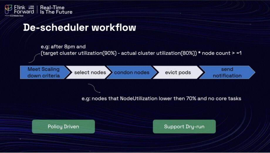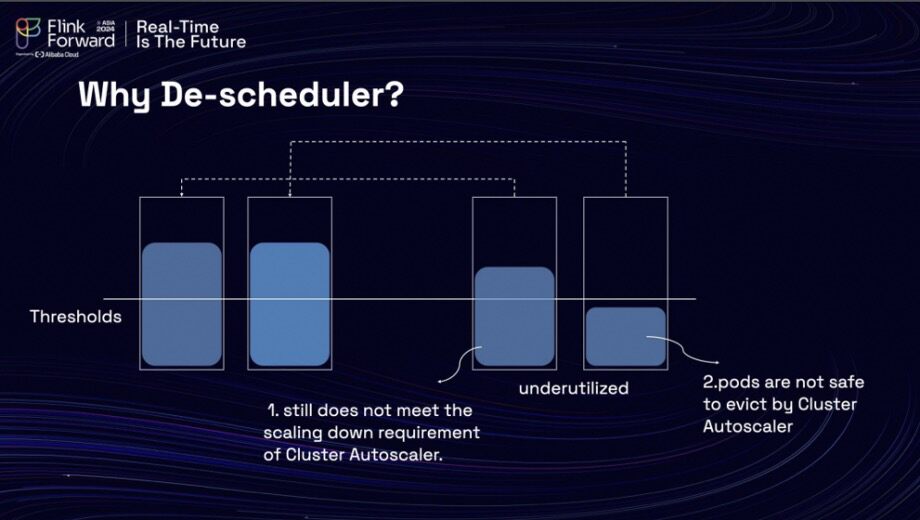 Despite implementing this strategy, the team still could not scale down their machines. The team utilizes Cluster Autoscaler, a Kubernetes tool, to assist in both scaling in and scaling out their machines within the Kubernetes cluster. There are several factors that hinder their ability to scale in these machines effectively. Firstly, not all of the Pods in the cluster can be scaled in, and there are instances where Pods remain on nodes that are under low utilization. As a result, the utilization of these nodes does not meet the necessary criteria for scaling down as defined by Cluster Autoscaler. Additionally, the replica set of the task manager is set to 0, which prevents eviction by the Cluster Autoscaler. Consequently, it is imperative for the scheduled autoscaler to safely evict the Pods from the low-utilization nodes.