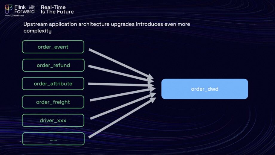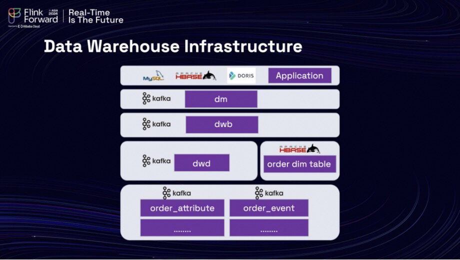 A typical scenario within this data warehousing framework involves managing tables such as 'order' and 'order_freight.' These tables produce database changes that are streamed downstream as binlog changes. To effectively integrate this data, the team employs a streaming join that allows for real-time data processing. Additionally, there is a table known as 'order_attribute',which functions as a key-value table that must be synchronized with Hbase. To create a cohesive dataset for the detailed layer (DWD), the team executes a task that requires combining this data through a lookup join. This dual-join process—streaming join and lookup join—presents significant challenges that the team actively works to overcome.