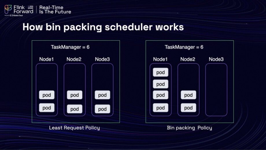 Upon conducting research, the team discovered that a bin packing scheduling strategy could potentially alleviate the situation. The graph on the left illustrated the default behavior of the Kubernetes scheduler under the Least Request Policy, while the graph on the right demonstrated how the Bin-packing Policy could help redeploy pods to higher-utilization nodes, thereby reducing resource fragmentation.