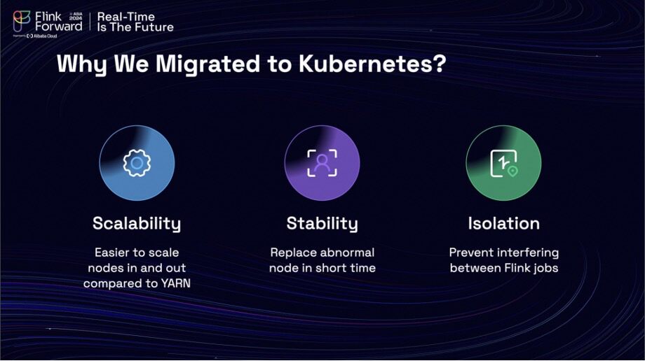 First, the reasons for migrating to a Kubernetes cluster were threefold. The enhanced scalability of infrastructure resources compared to a traditional YARN cluster was a significant factor. Additionally, Kubernetes offered improved stability for recovering from node disasters and provided better isolation to prevent interference between Flink jobs deployed on the same machine. The Kubernetes cluster architecture utilized the open-source Flink Kubernetes operator to manage the lifecycle of Flink jobs.