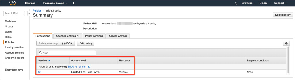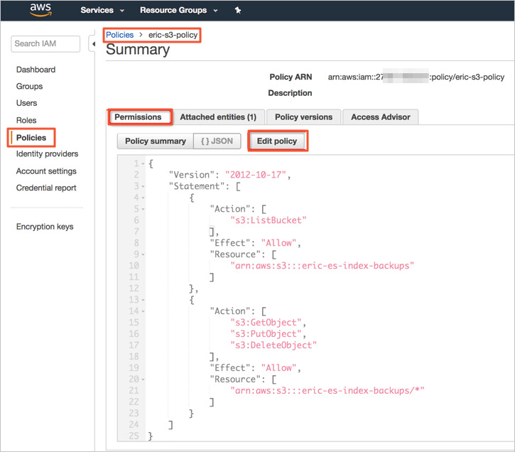 You must attach an IAM policy to the IAM role. The policy specifies the S3 bucket that is used to store the manual snapshots of the Amazon OpenSearch Service domain. The following code shows a sample policy. In the policy, the ARN of the eric-es-index-backups bucket is specified.