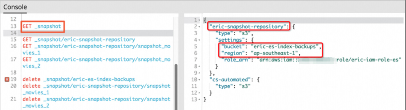 Create a snapshot repository.Log on to the Kibana console of the Elasticsearch cluster. For more information, see Log on to the Kibana console. Then, in the left-side navigation pane, click Dev Tools. On the Console tab of the page that appears, run the following command to create a snapshot repository. The name of the snapshot repository must be the same as that of the snapshot repository registered with Amazon OpenSearch Service.