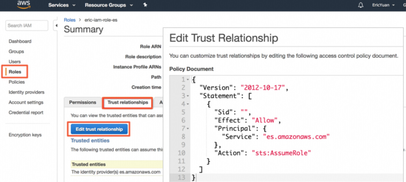 When you create a role in the IAM console, Amazon OpenSearch Service is not included in the Select role type drop-down list. You can select Amazon EC2 from the drop-down list and create the role as prompted. Then, change ec2.amazonaws.com in the trust relationship of the role to es.amazonaws.com.