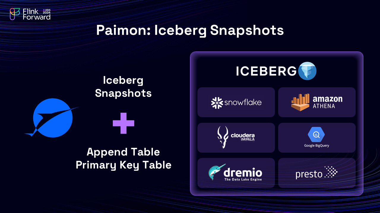 Finally, Paimon also welcomes Iceberg users by providing Iceberg compatible snapshots. Iceberg users can query Paimon tables just like Iceberg tables with their favorite tools, including Amazon Athena, Impala, Presto and much more.