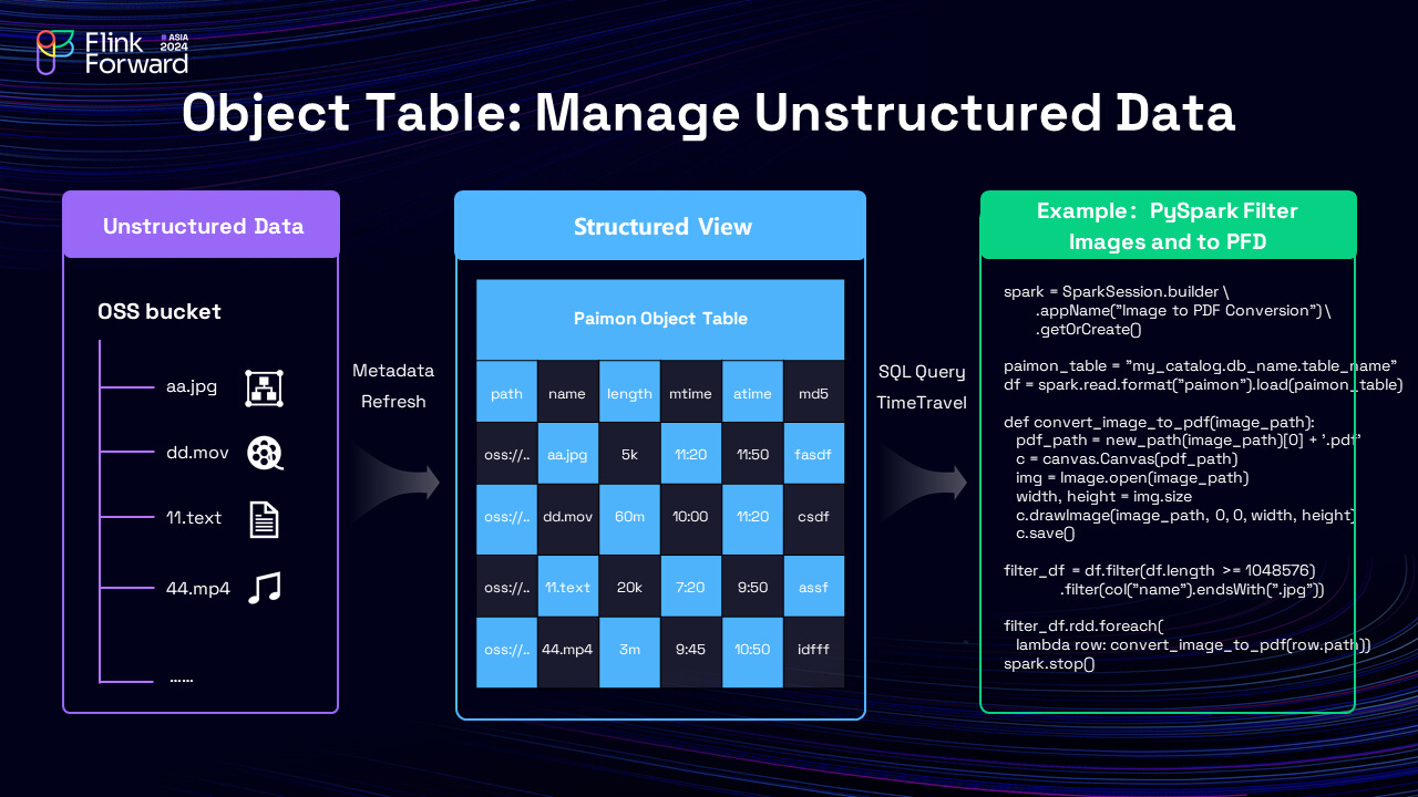 3)Integration with AI: Paimon provides Python APIs, which are essential for AI development. Data can be read from and written to Paimon using Python, and Paimon also introduces the Object Table feature, which maps unstructured data (e.g., images, videos) to structured tables, enabling analysis with tools like PySpark or Flink SQL.