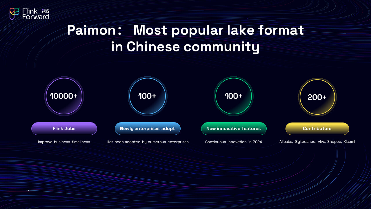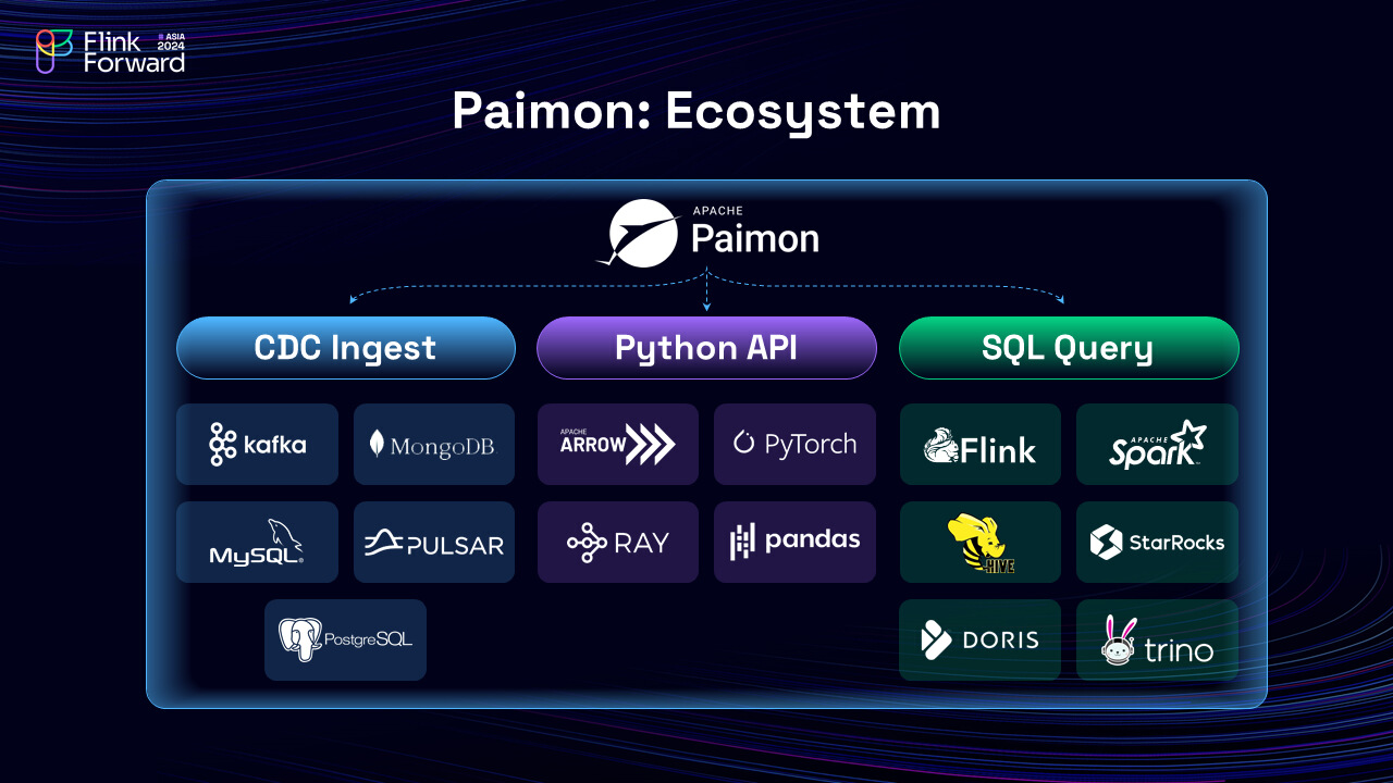 As an open-source project, Paimon continues to innovate, with contributions from Alibaba, ByteDance, Vivo, Xiaomi, and others. Paimon has graduated to an Apache top-level project and has a wide range of ecosystem support, opening to other engines like Spark, Starrocks, Presto, and more.